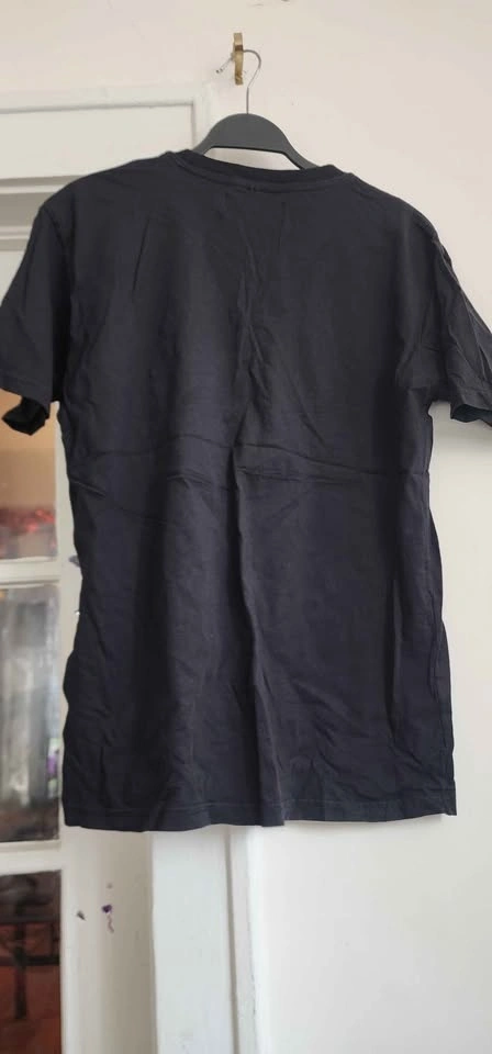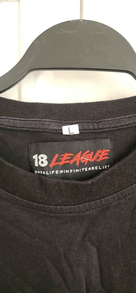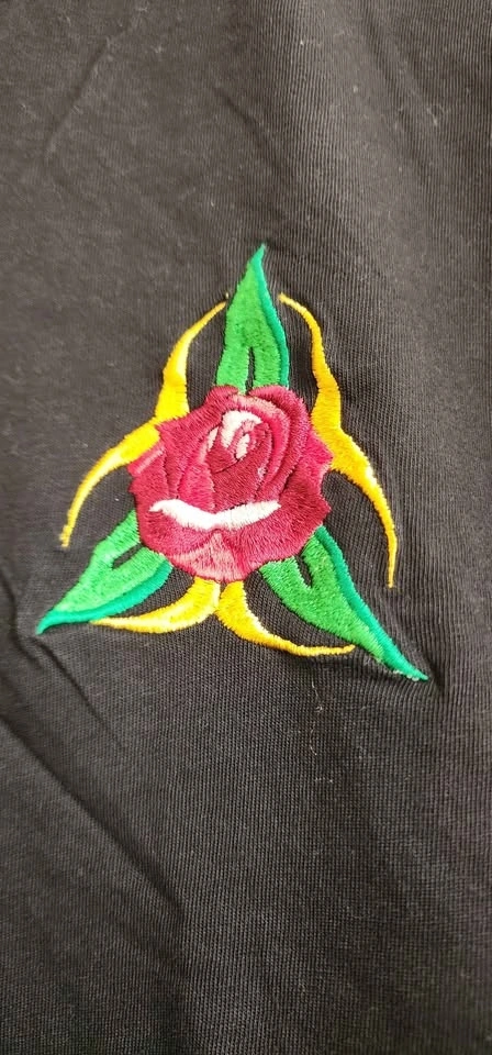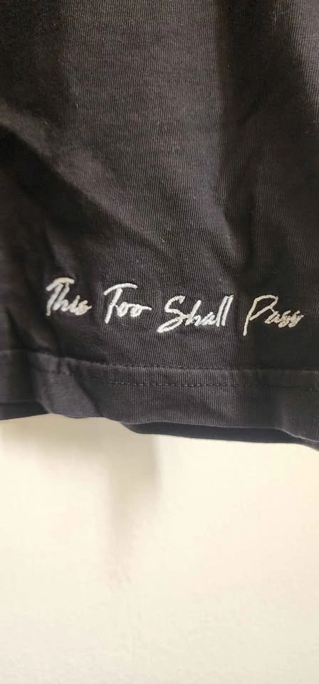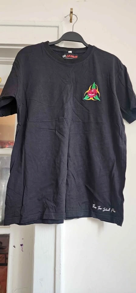 New never used, clothing brand: 18 League, embroidered rose and biohazard symbol. The brand name is visible on the inner tag and above the graphic, embroidered text "This Too Shall Pass" is written near the bottom right hem. Size: L
