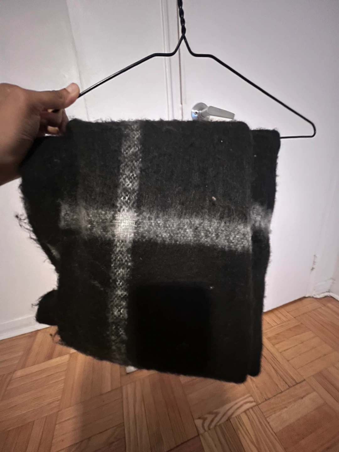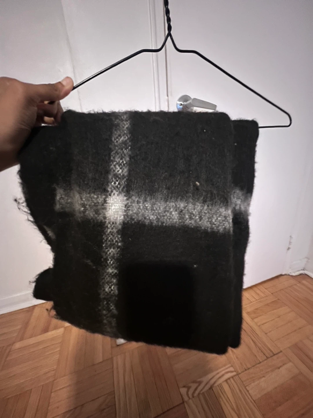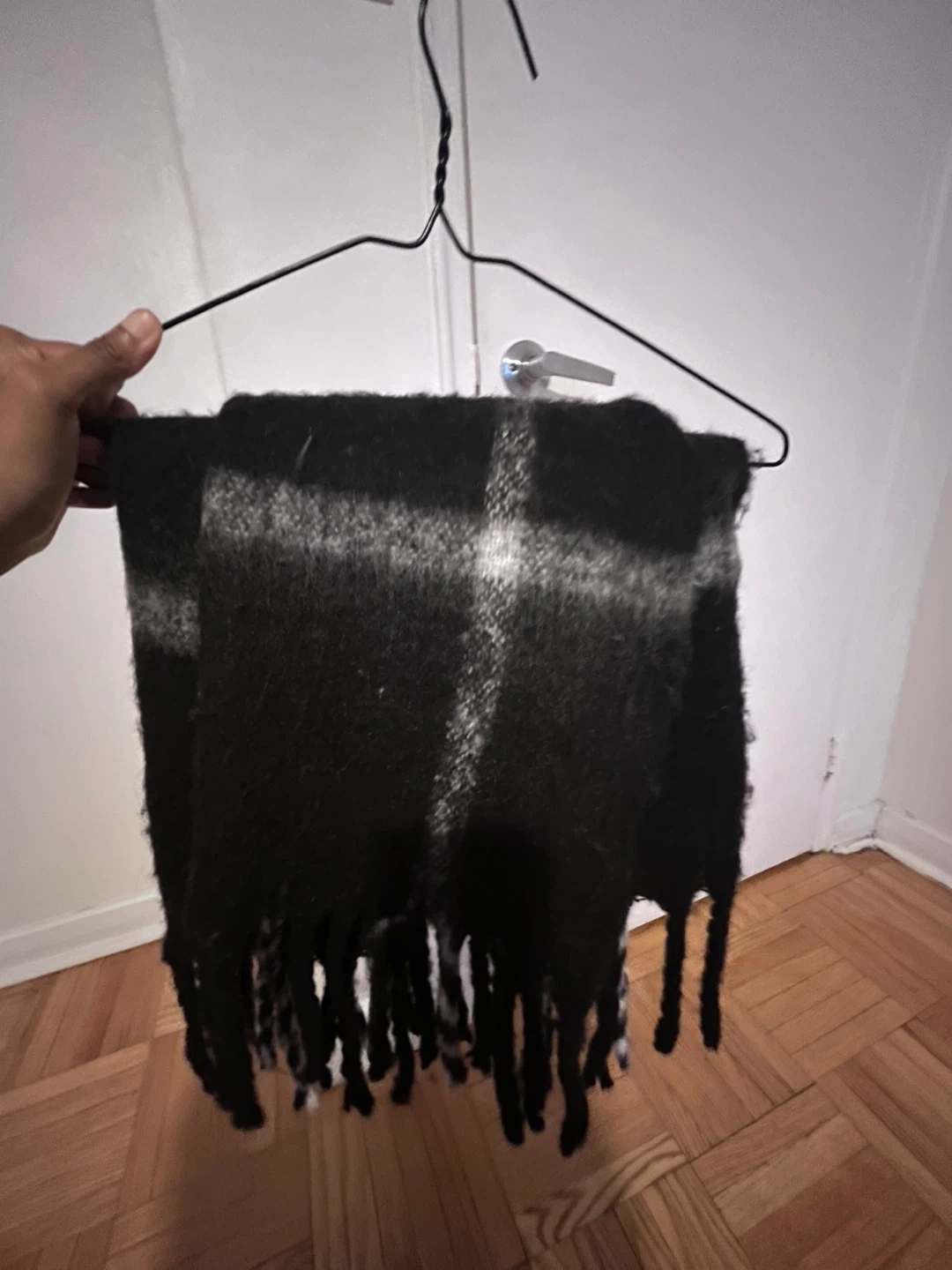 Here's a cozy black and white plaid scarf! It's in great condition and ready to keep you warm. It's made of a soft material and has a classic plaid pattern