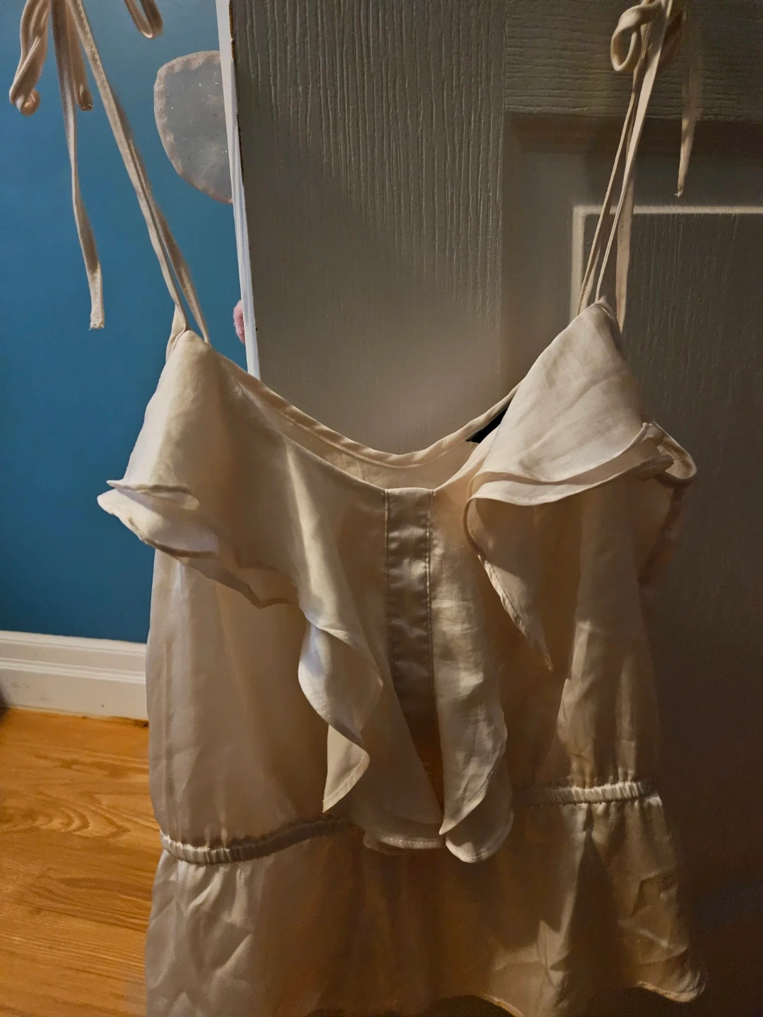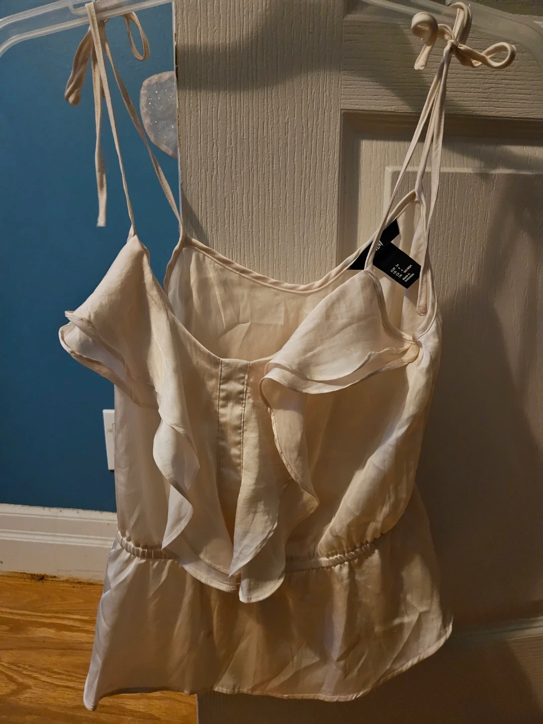 Selling a Zara cream-coloured cami top with a cute ruffle design! It's a size small and made of a silky-smooth material. Perfect for a night out or dressing up a casual outfit!