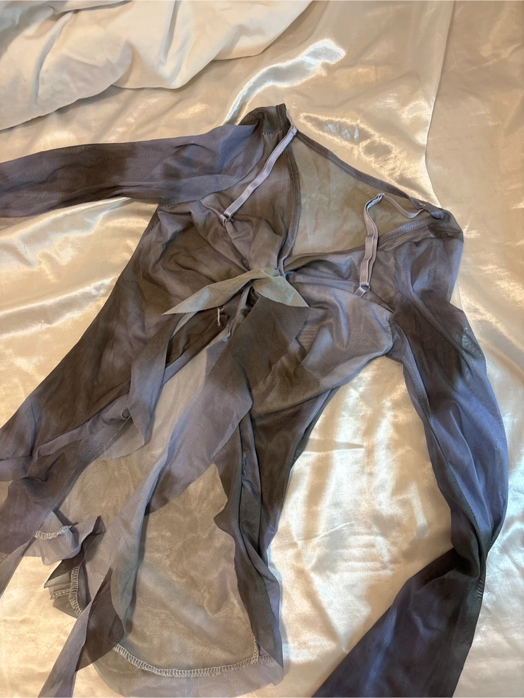 Selling a cute tie-front mesh top in a grey colour. It has long sleeves and a tie at the front. Perfect for layering or wearing on its own!