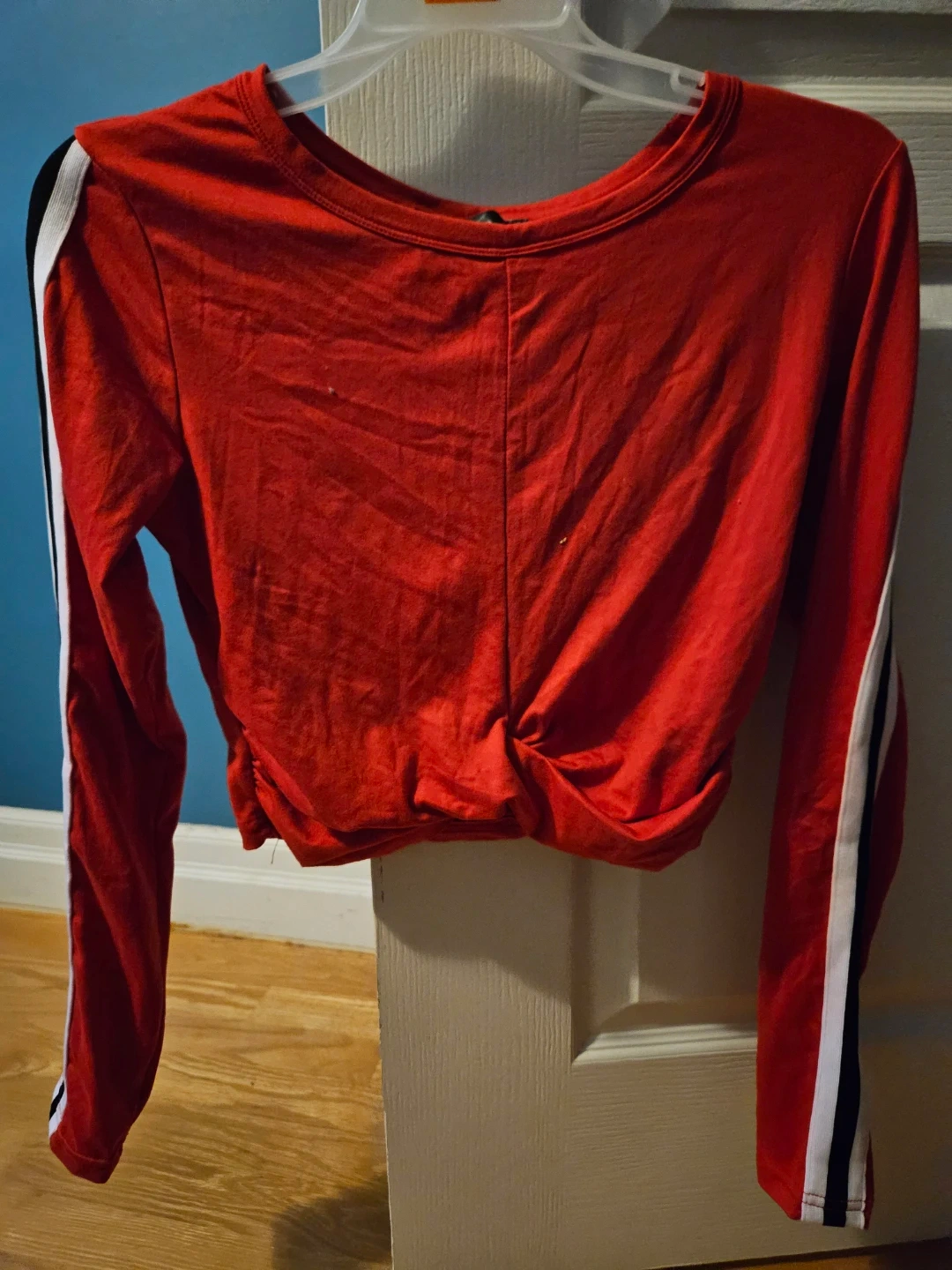 Here's a cute cropped red long sleeve top! It has a unique design with black and white stripes on the sleeves. Perfect for casual wear or layering
