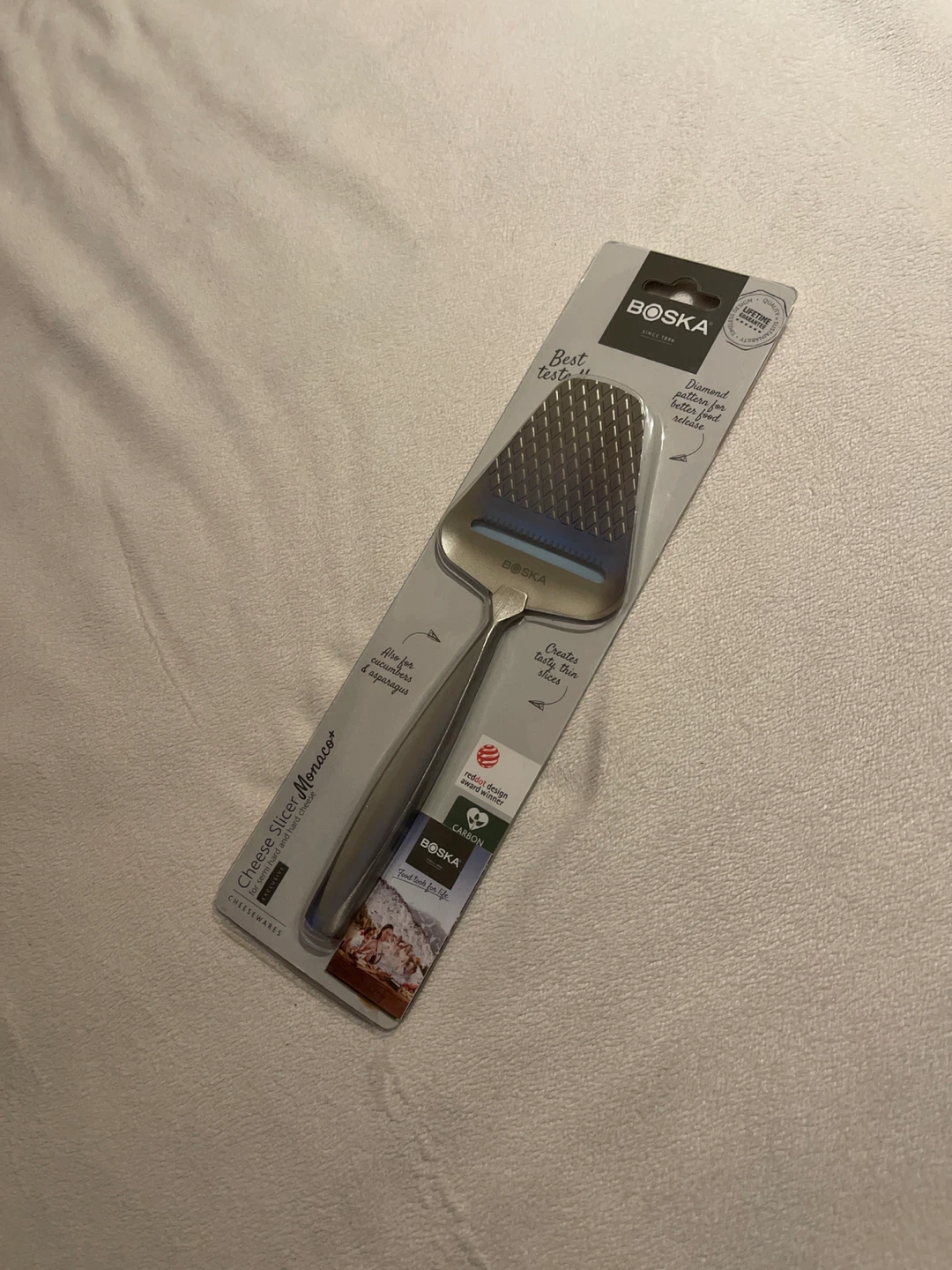 I'm selling a new Boska Cheese Slicer Monaco+! It's designed for semi-hard and hard cheeses. The diamond pattern helps with better food release, and it creates tasty, thin slices. It can also be used for cucumbers and asparagus!