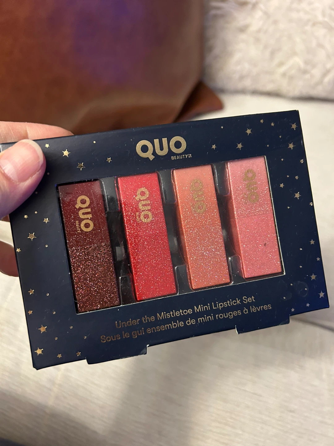 Selling a Quo Beauty Under the Mistletoe Mini Lipstick Set. It's a cute and fun set of 4 creamy lipsticks, finely dusted with glitter revealing a luxurious and moisturizing formula. Light, medium and deep shades have you covered morning, noon and night