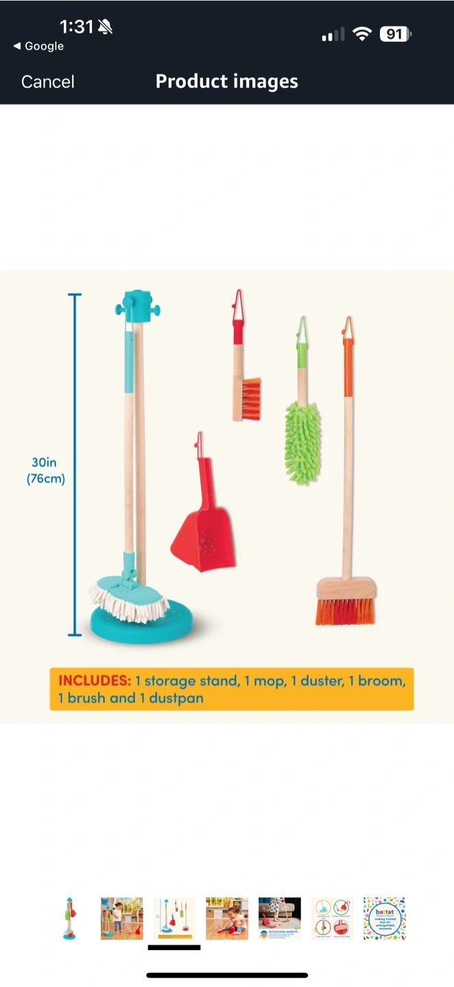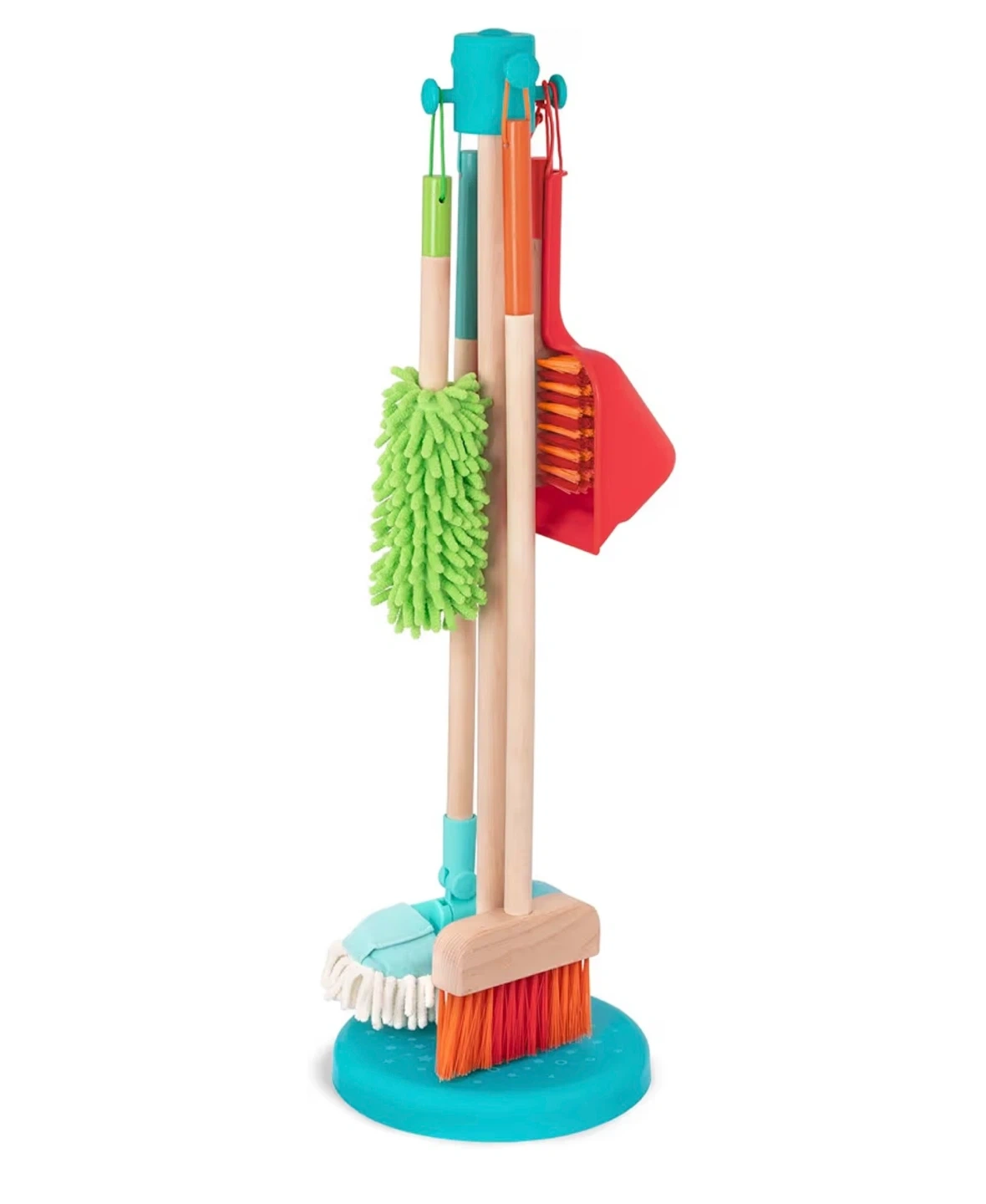 This Melissa & Doug cleaning set is perfect for kids who love to help around the house! It includes a storage stand, mop, duster, broom, brush, and dustpan. The set is 30 inches (76cm) tall and is great for imaginative play.