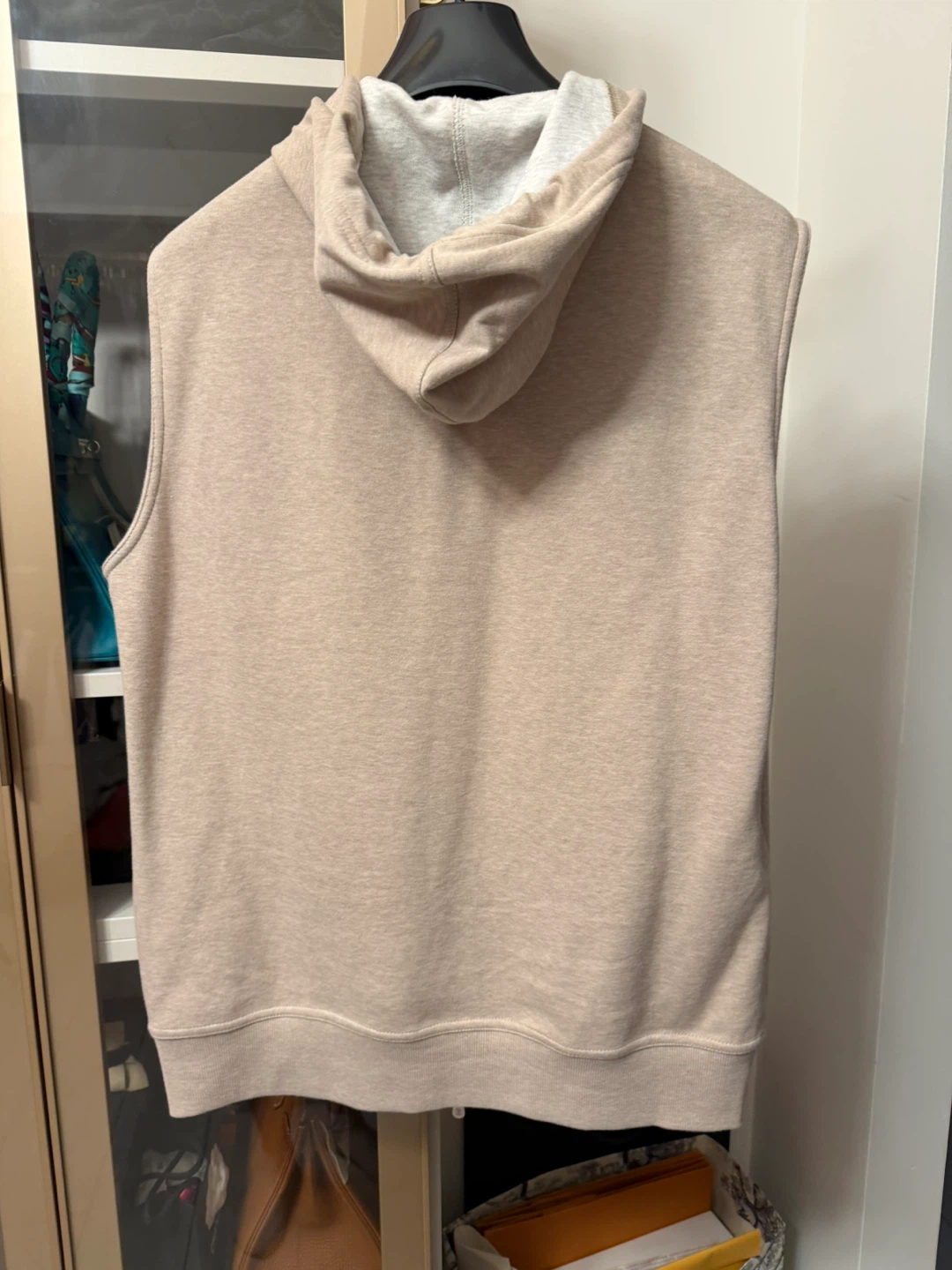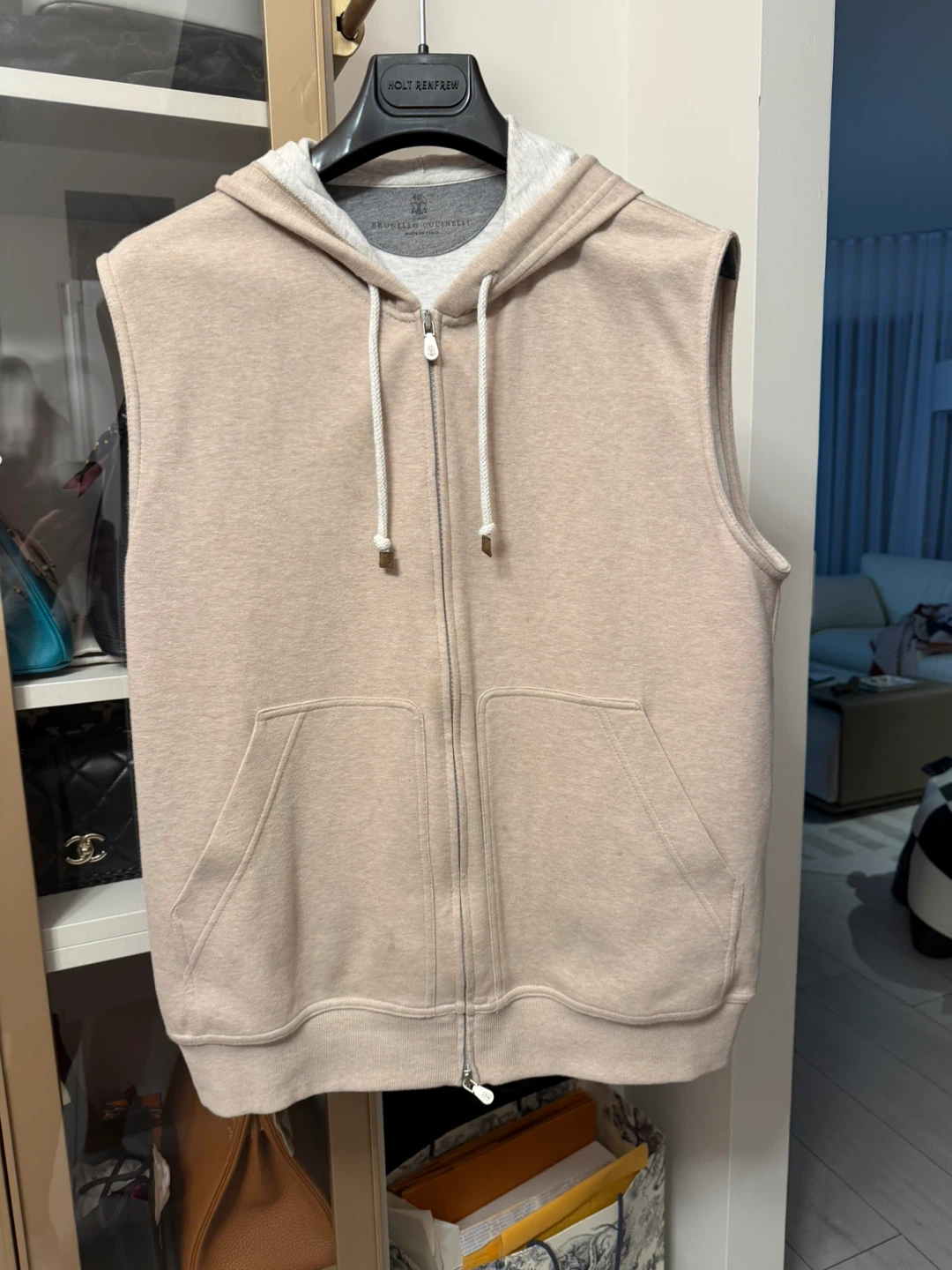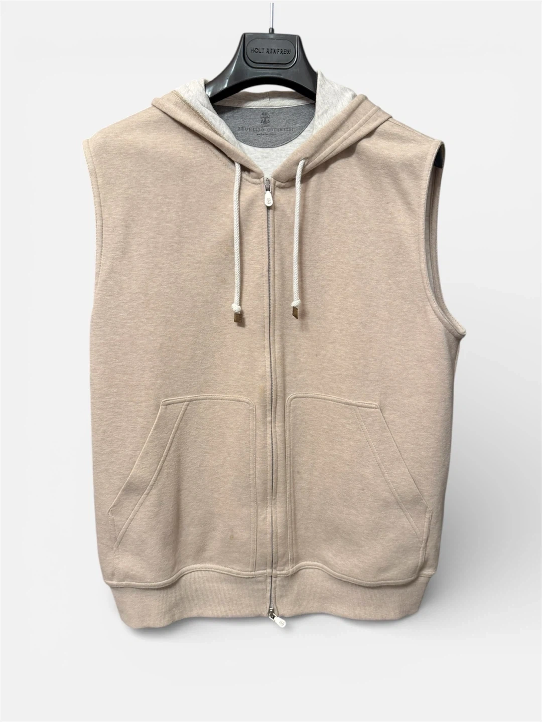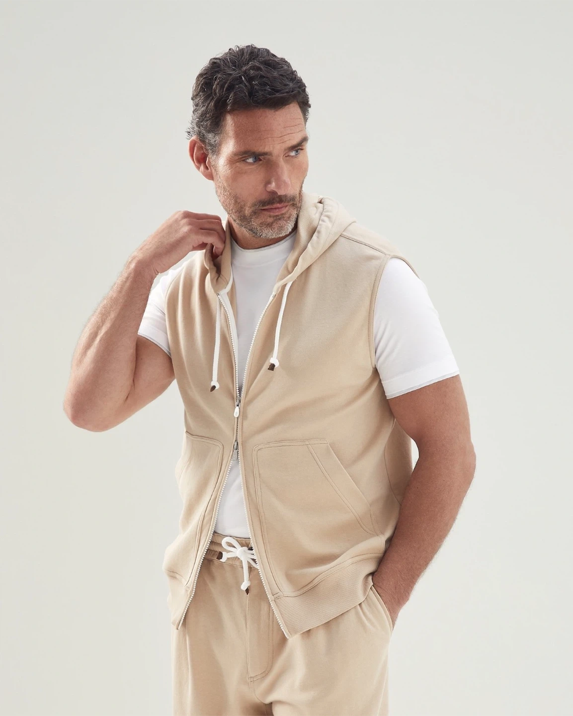 Authentic Brunello Cucinelli sleeveless zip-up hoodie vest crafted in Italy. A refined casual essential featuring a full front zipper, drawstring hood with signature hardware tips, and front kangaroo pockets. Perfect for effortless layering and elevated everyday wear.