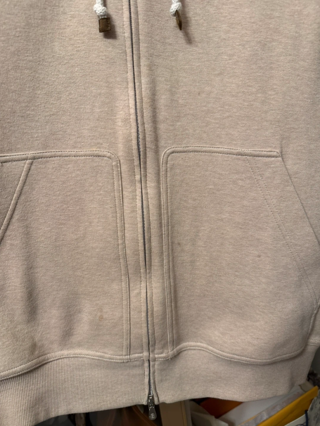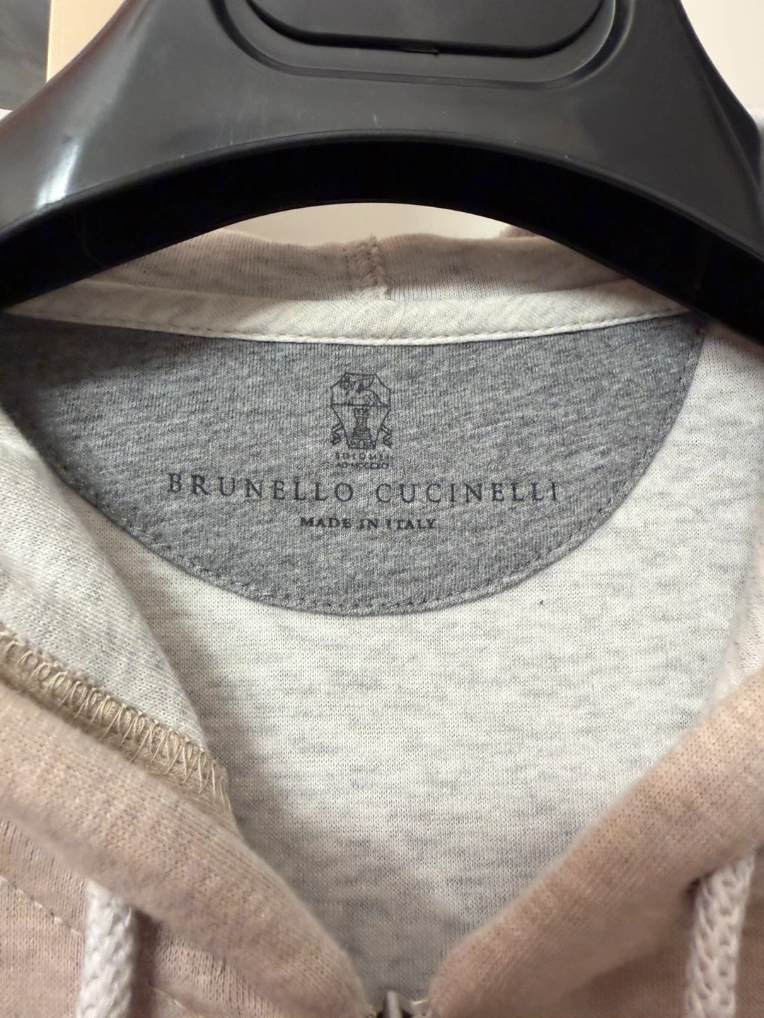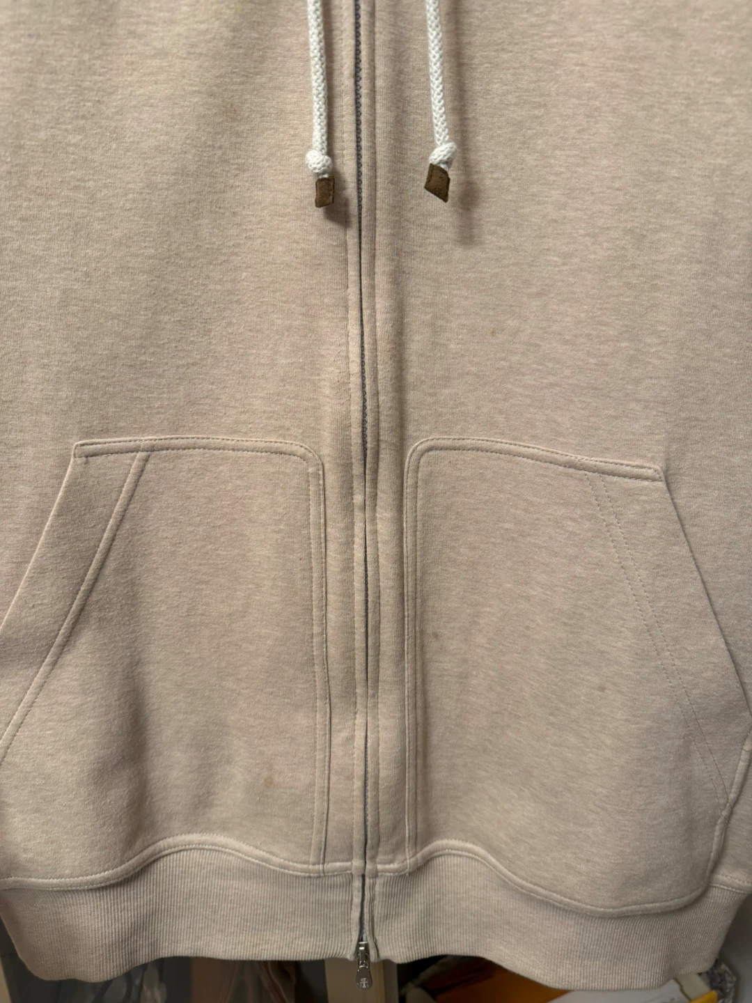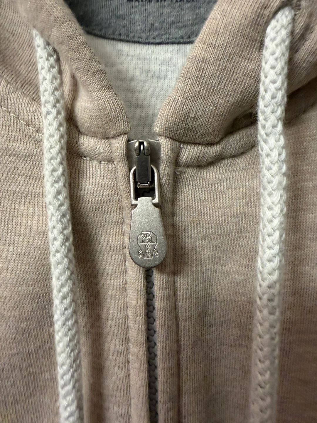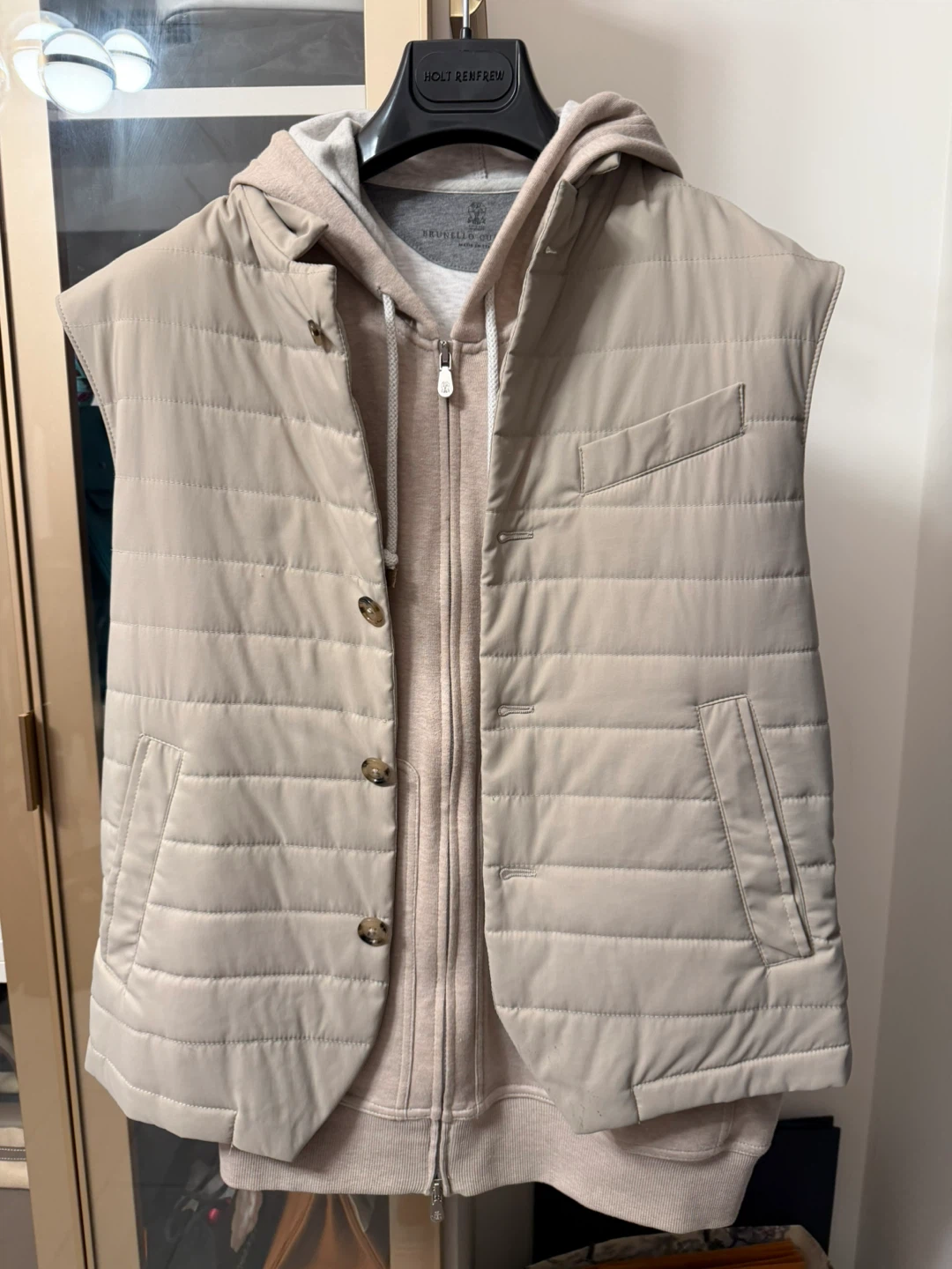 Authentic Brunello Cucinelli sleeveless zip-up hoodie vest crafted in Italy. A refined casual essential featuring a full front zipper, drawstring hood with signature hardware tips, and front kangaroo pockets. Perfect for effortless layering and elevated everyday wear.