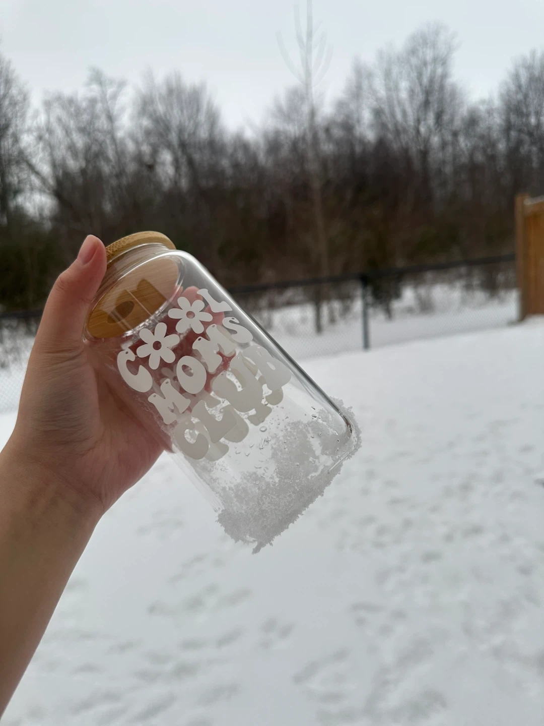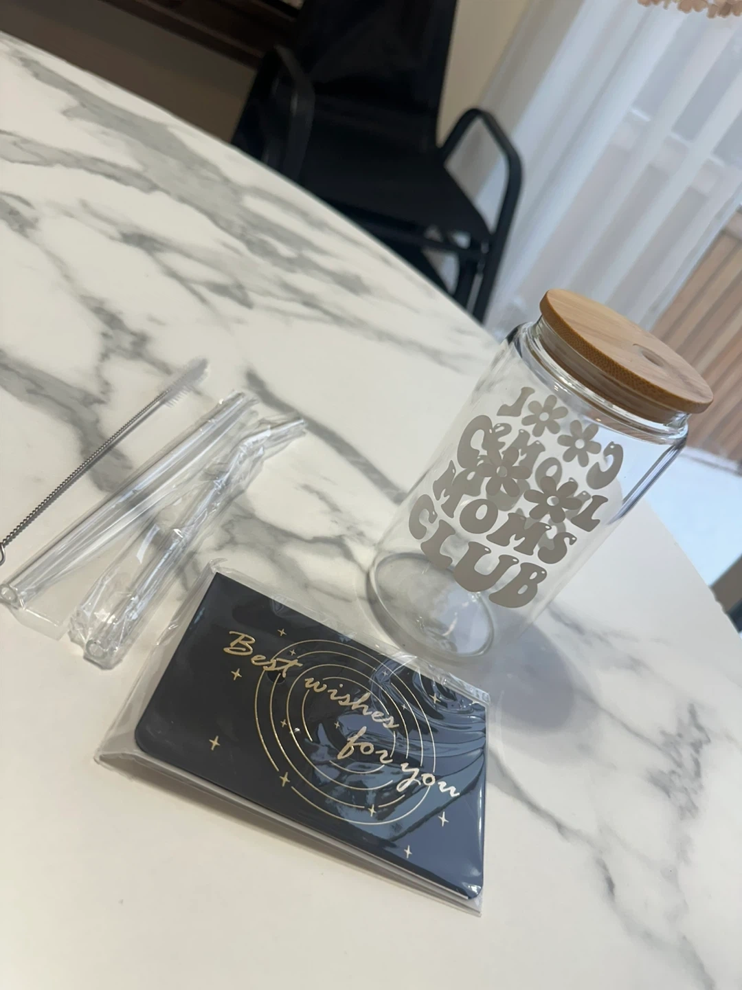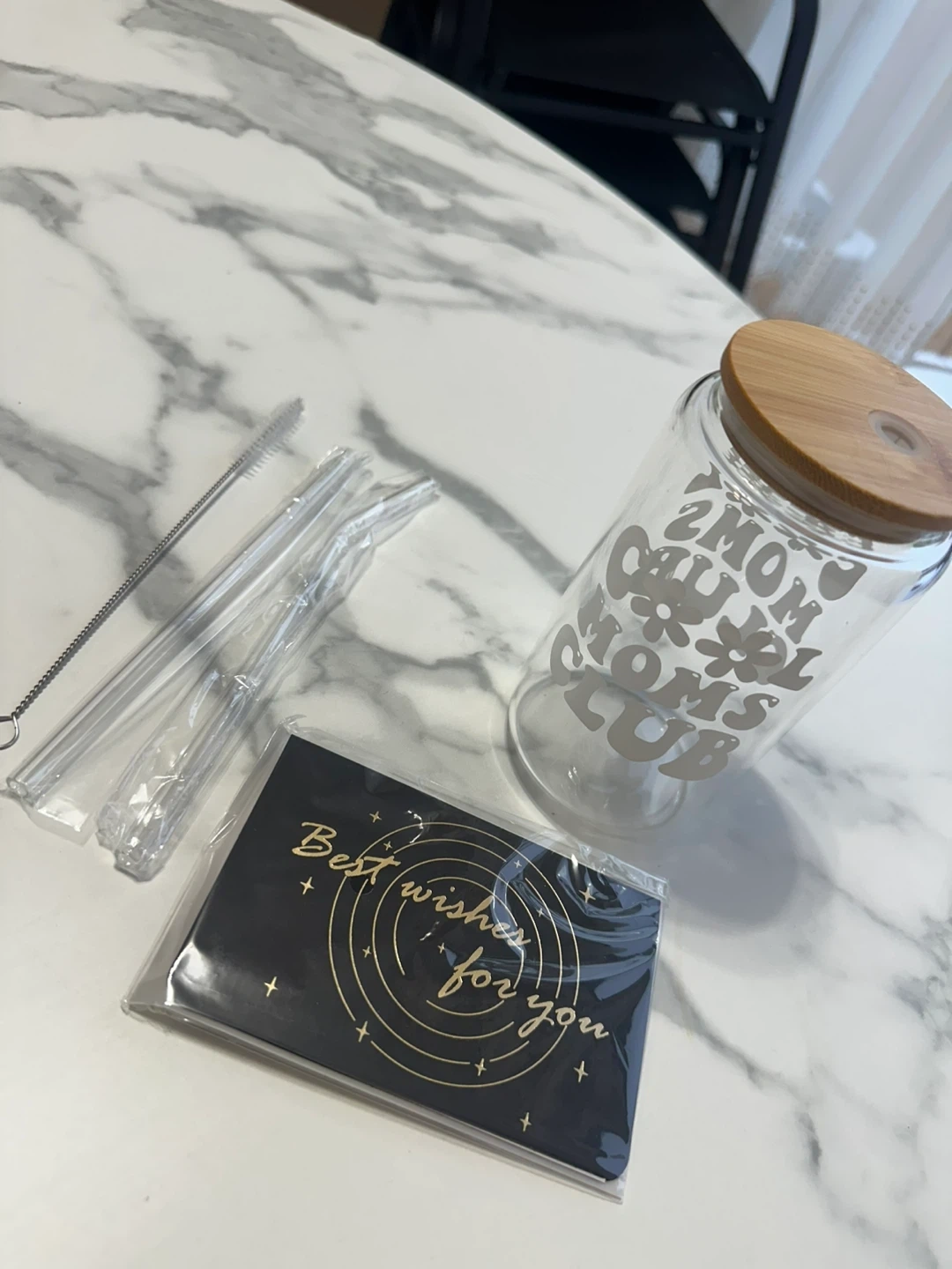 Selling a cute glass cup with a bamboo lid and straw! It has "Cool Moms Club" printed on the side. Included are the cup, bamboo lid, straw, and cleaning brush. It's in great condition and ready for a new owner!
