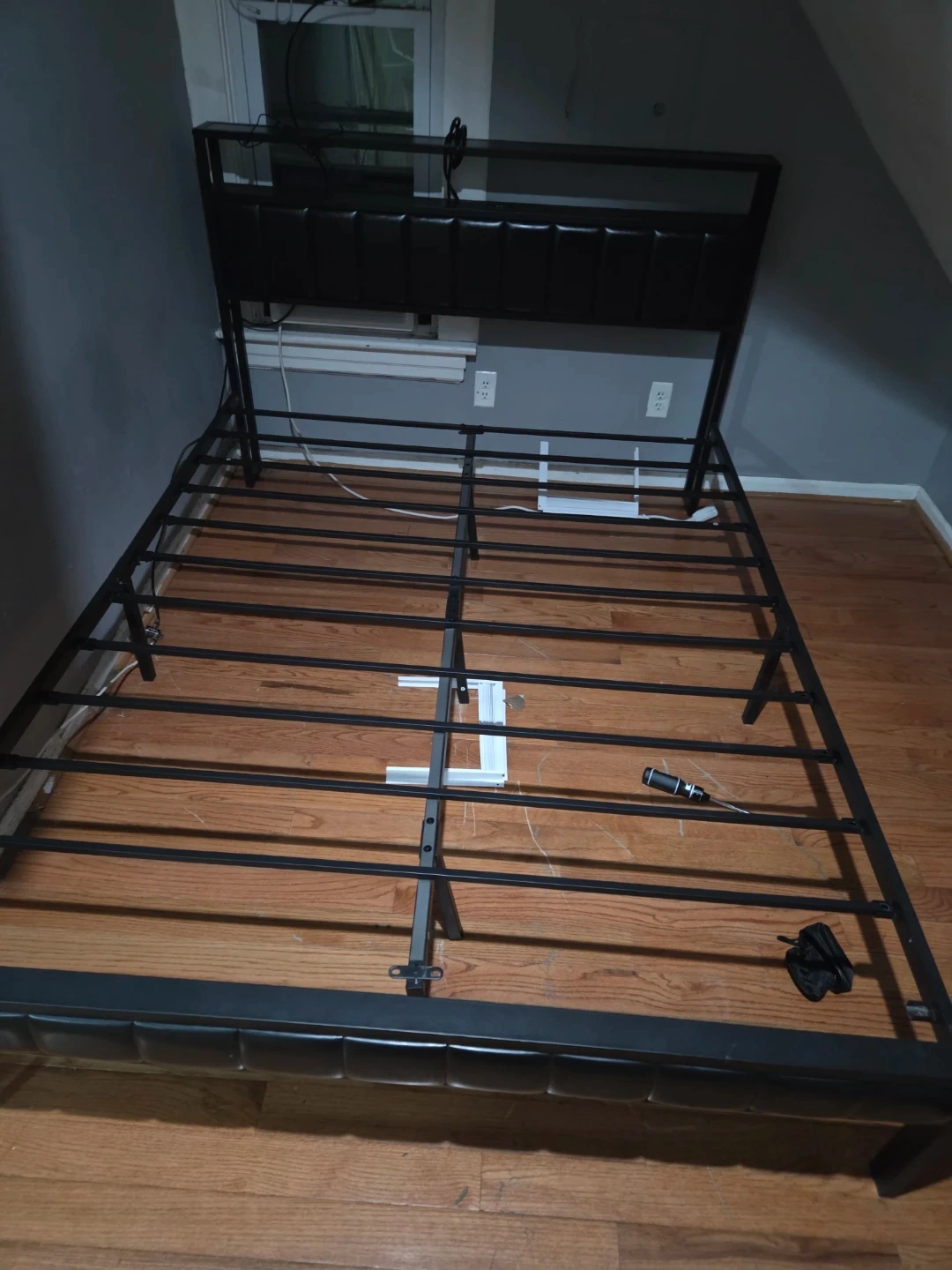 Selling a queen size sturdy black metal bed frame, complete with a headboard. It features a padded headboard and built-in outlets for convenience. Perfect for upgrading your bedroom!