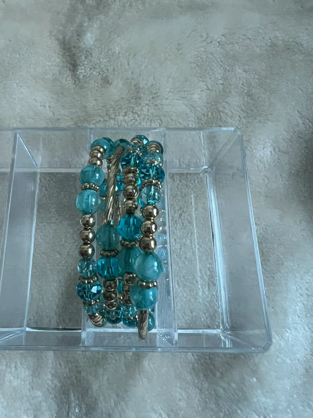 Here's a cute bracelet set featuring teal and gold beads! It's in new condition and would be a lovely addition to your jewellery collection