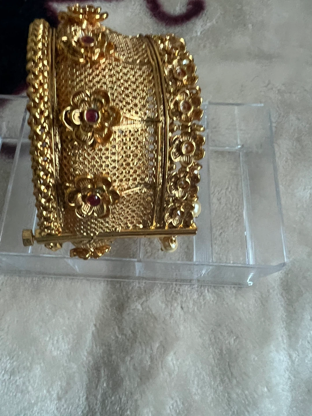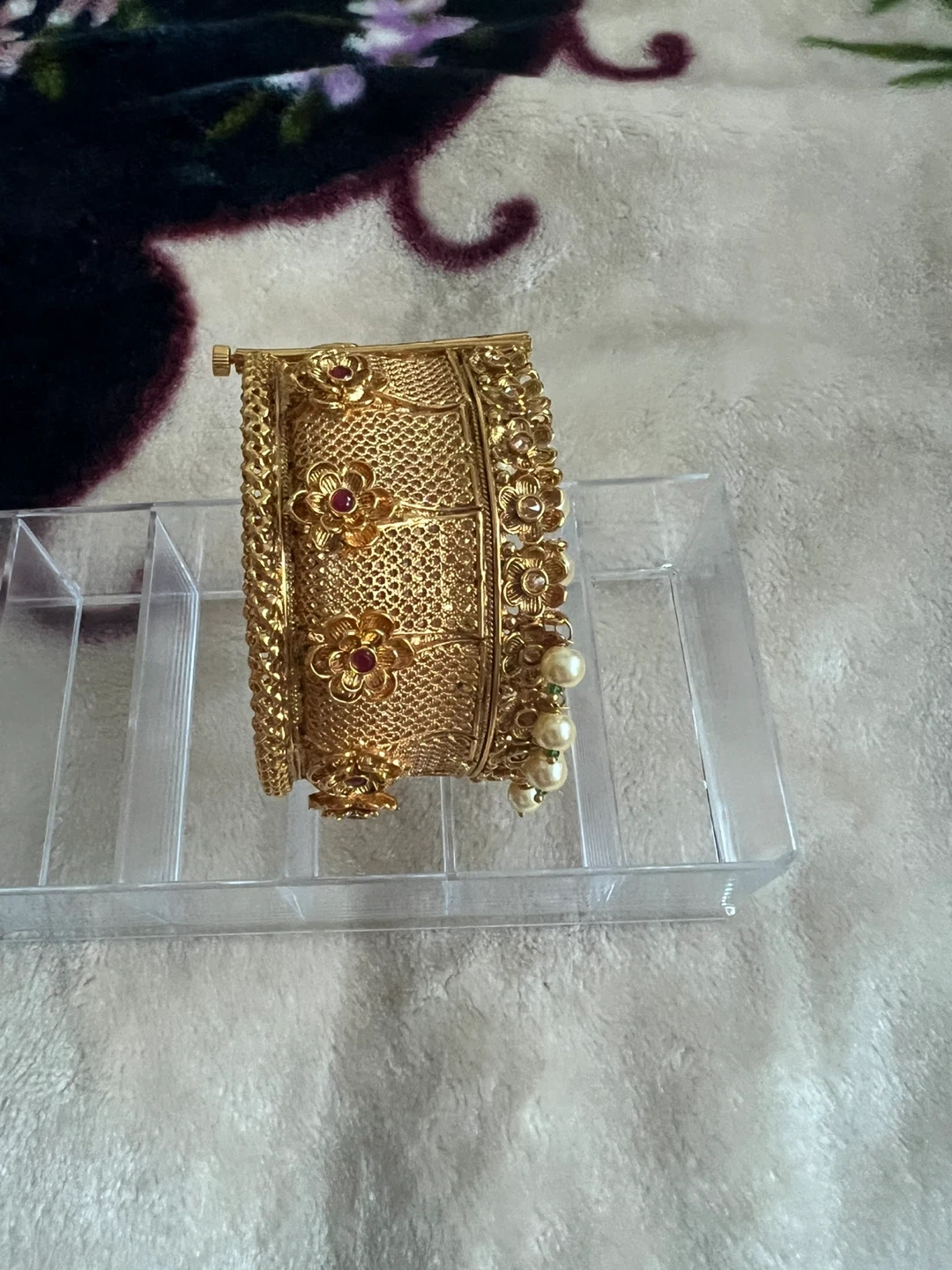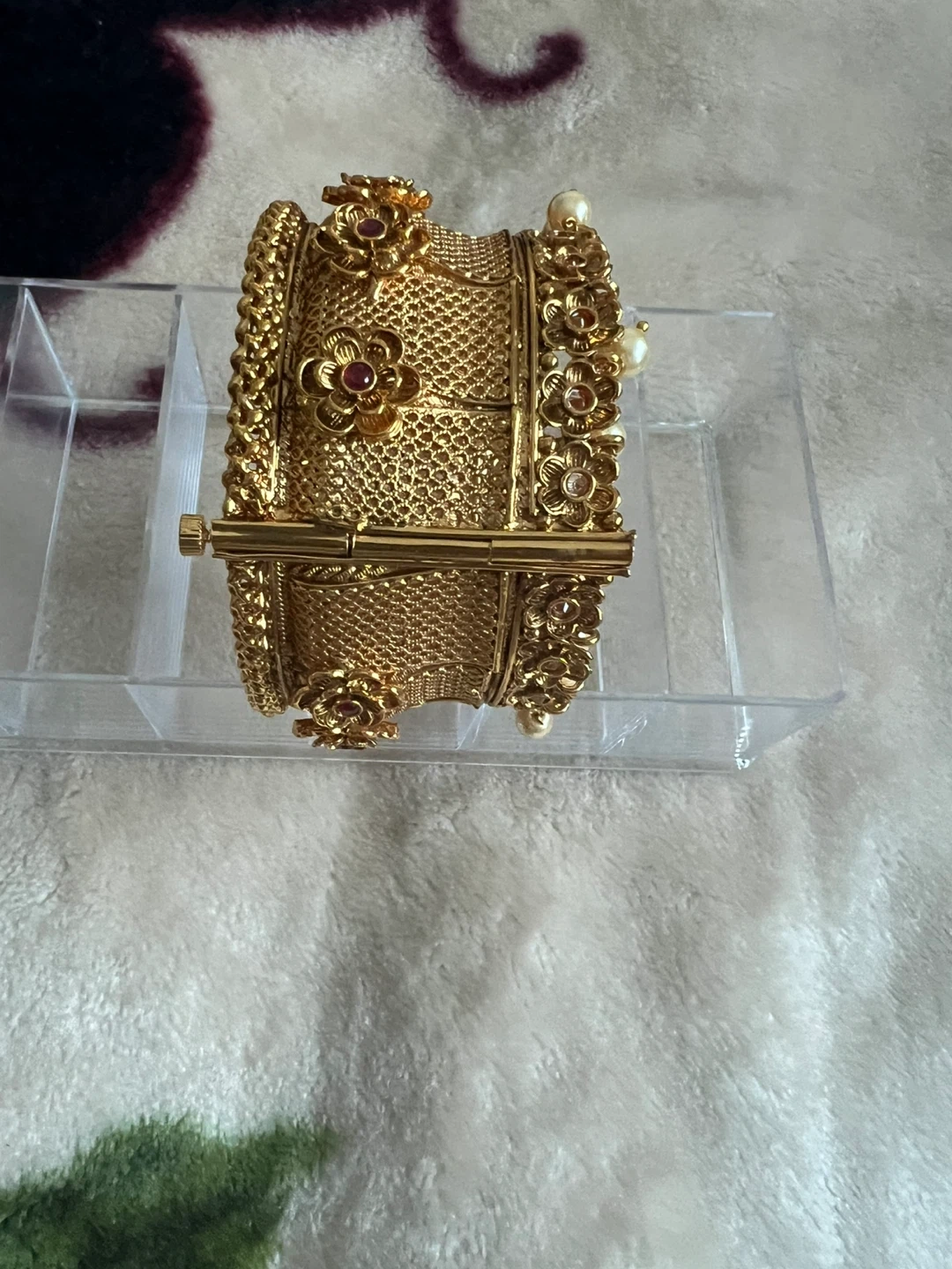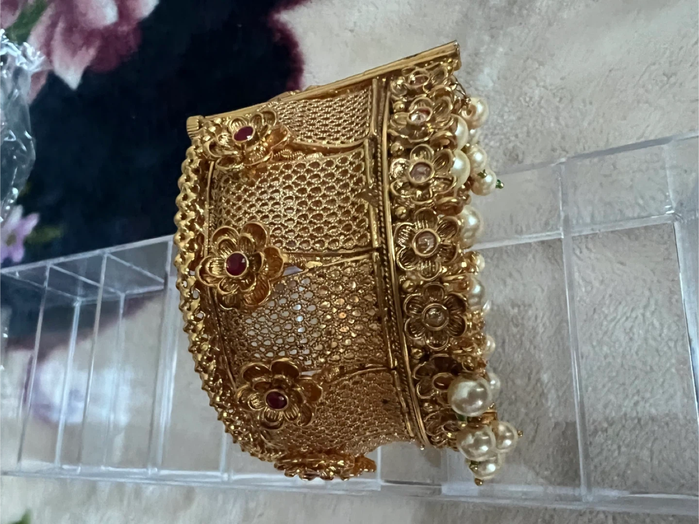 Selling a beautiful gold-toned bangle featuring intricate floral designs and pearl accents. It's in new condition and would be a lovely addition to any jewelry collection!