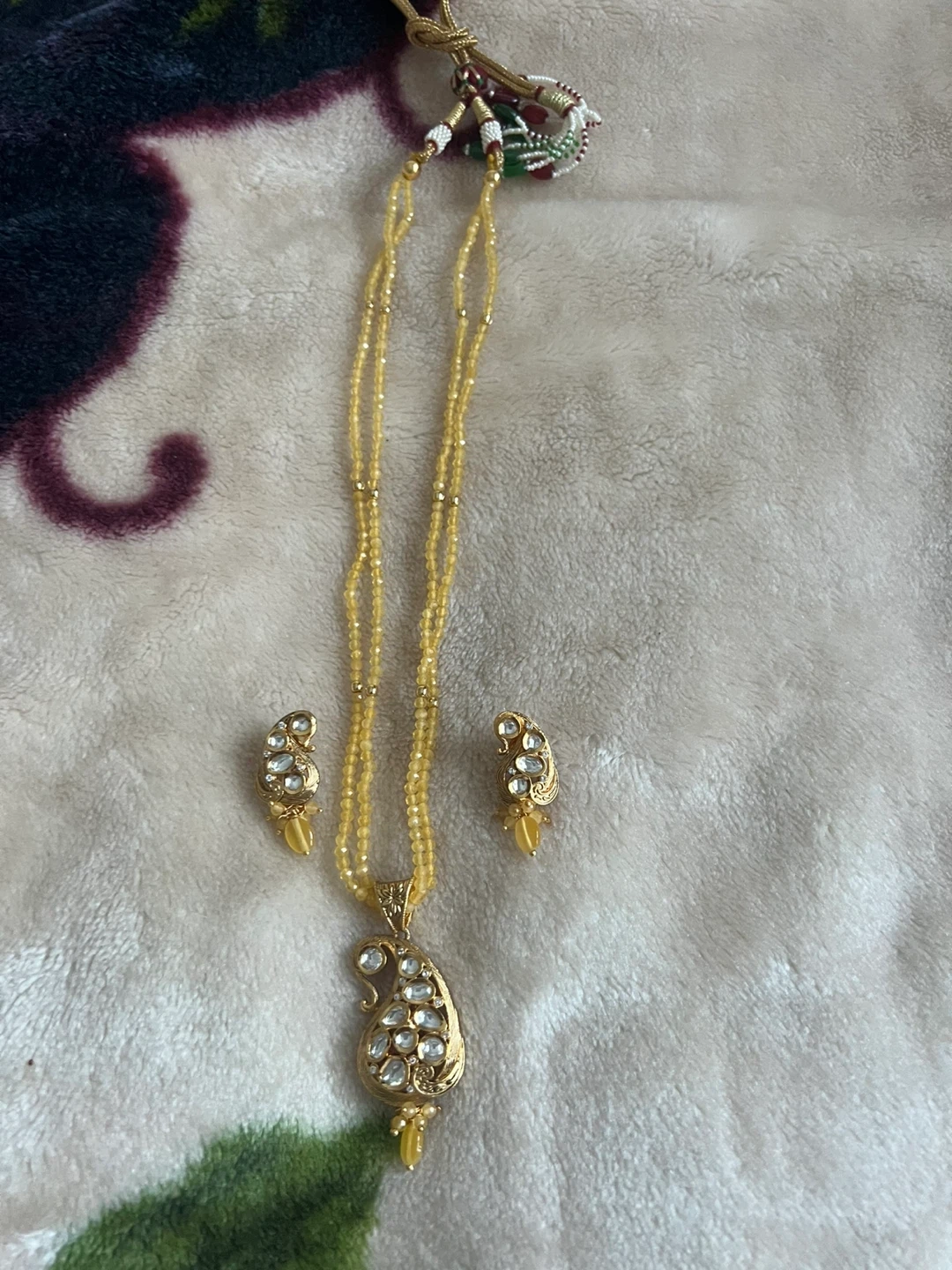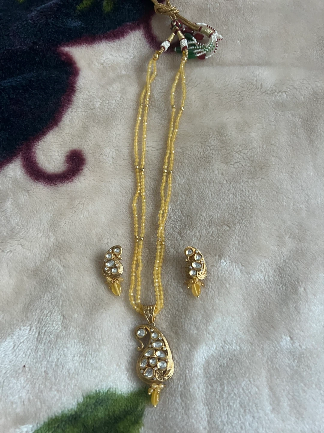 Selling a lovely necklace and earring set! The set features a gold-tone finish with intricate detailing and sparkling accents. Perfect for adding a touch of elegance to any outfit