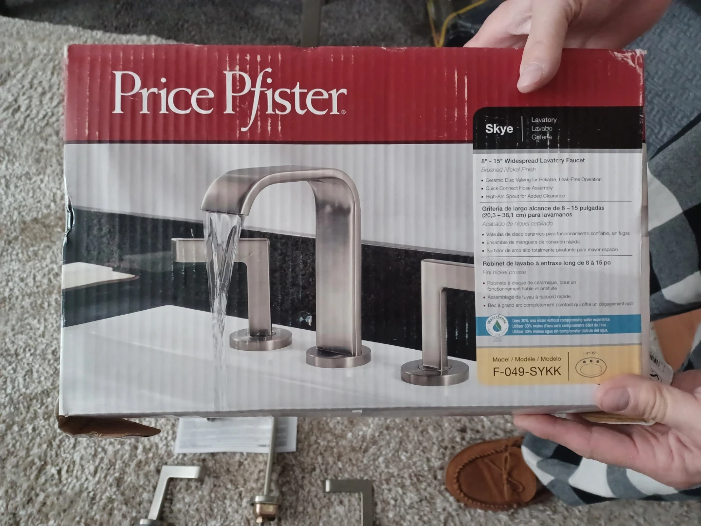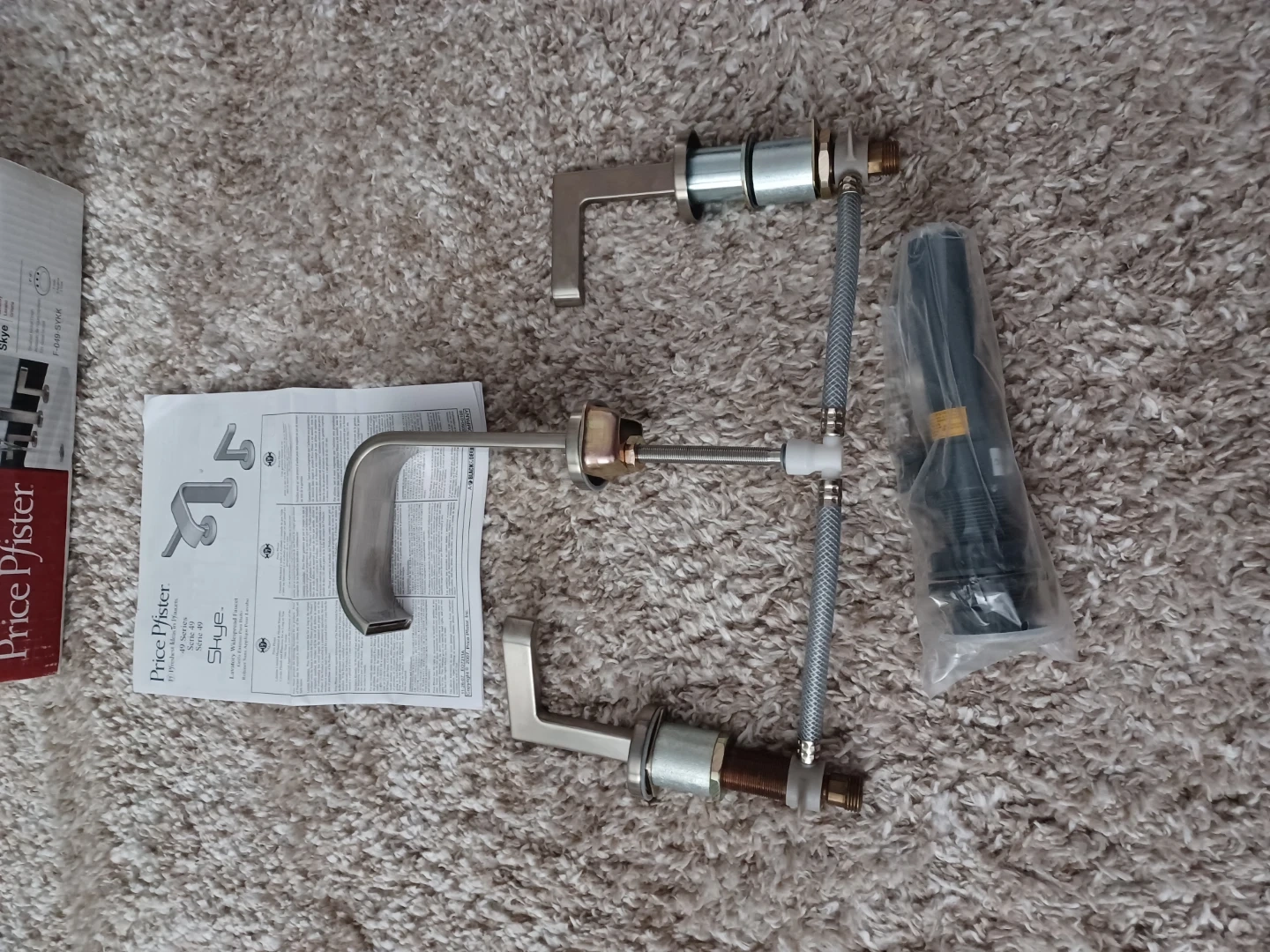 Selling a Price Pfister Skye lavatory faucet, model F-049-SYKK. It's a beautiful widespread faucet with a brushed nickel finish. The faucet features a ceramic disc valving for reliable, leak-free operation and a quick connect hose assembly. Includes the original box