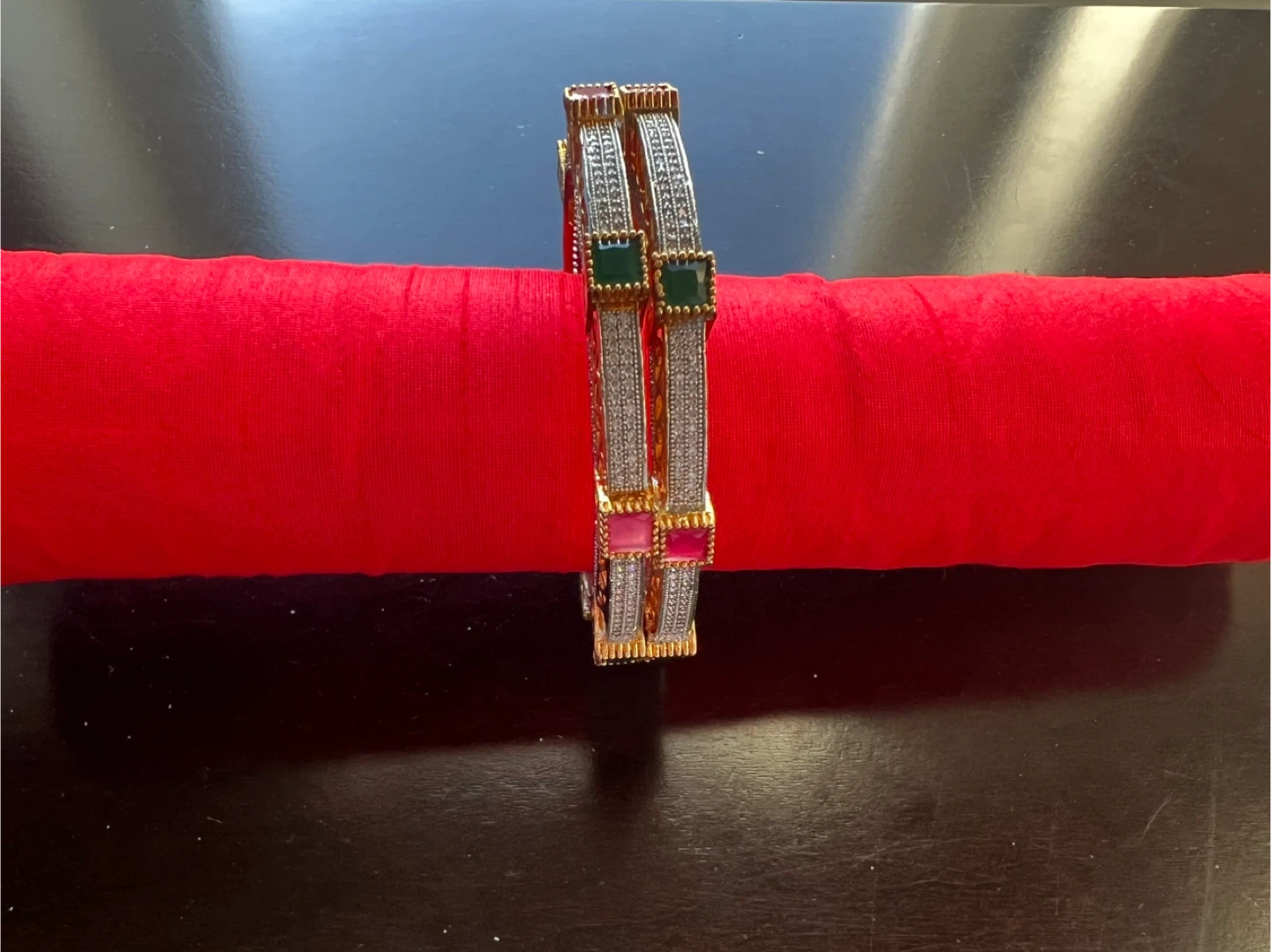 Selling a pair of bangles featuring a silver and gold tone design. They are adorned with pink and green gemstones. Perfect for adding a touch of elegance to any outfit!