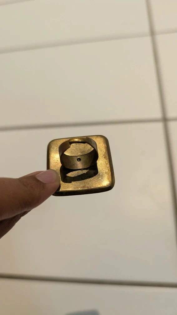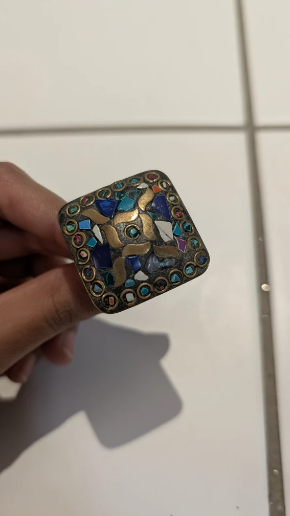 Selling a vintage square ring. It has a unique design with colourful stones and a gold-tone metal. It's in great condition and would make a lovely addition to any jewelry collection
