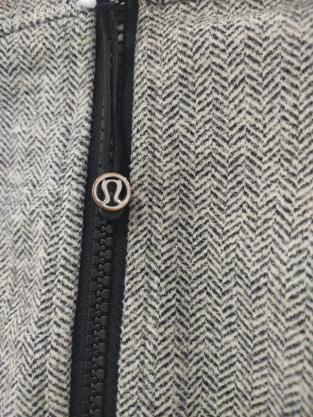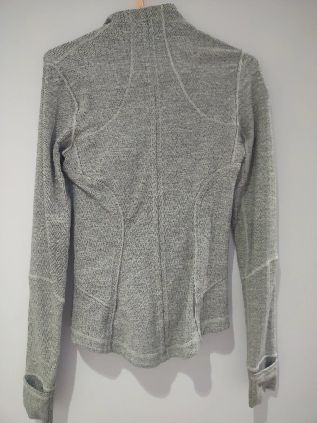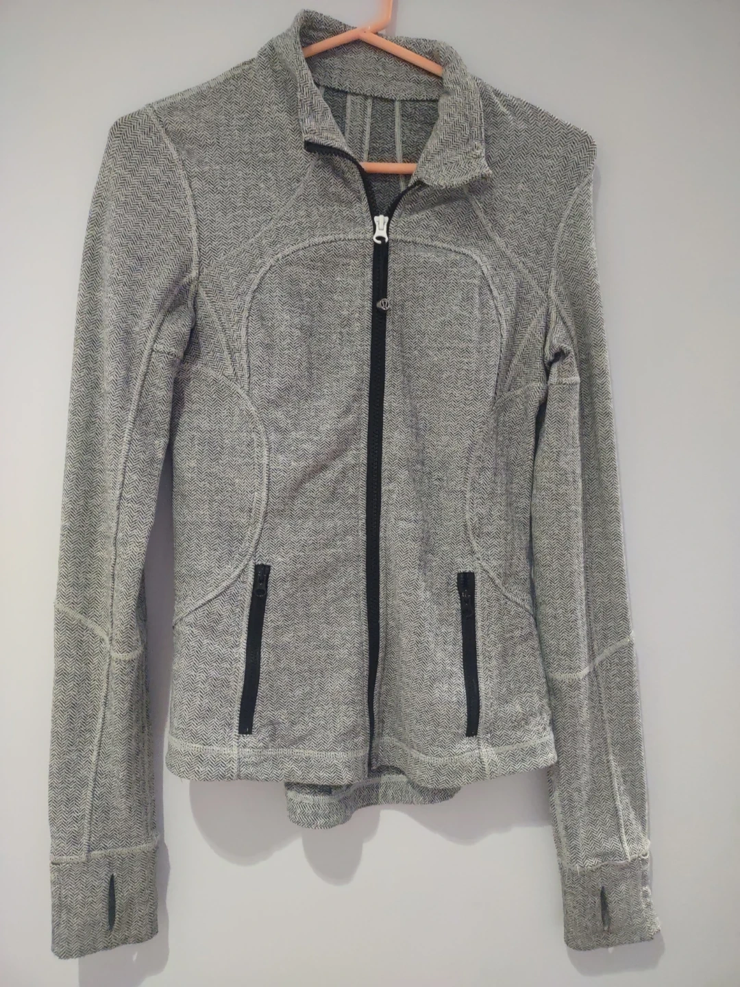 Selling a Lululemon jacket in size 4. It's a stylish and comfortable piece, perfect for workouts or casual wear. The jacket features a unique grey herringbone pattern and thumb holes for added convenience. Great for layering! Its been worn a handful of times but still in great condition!