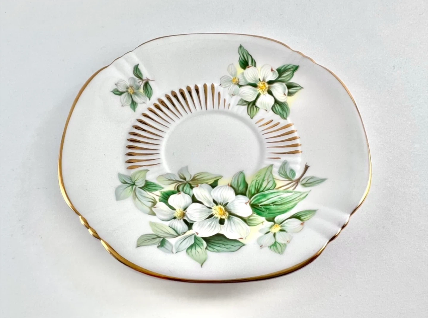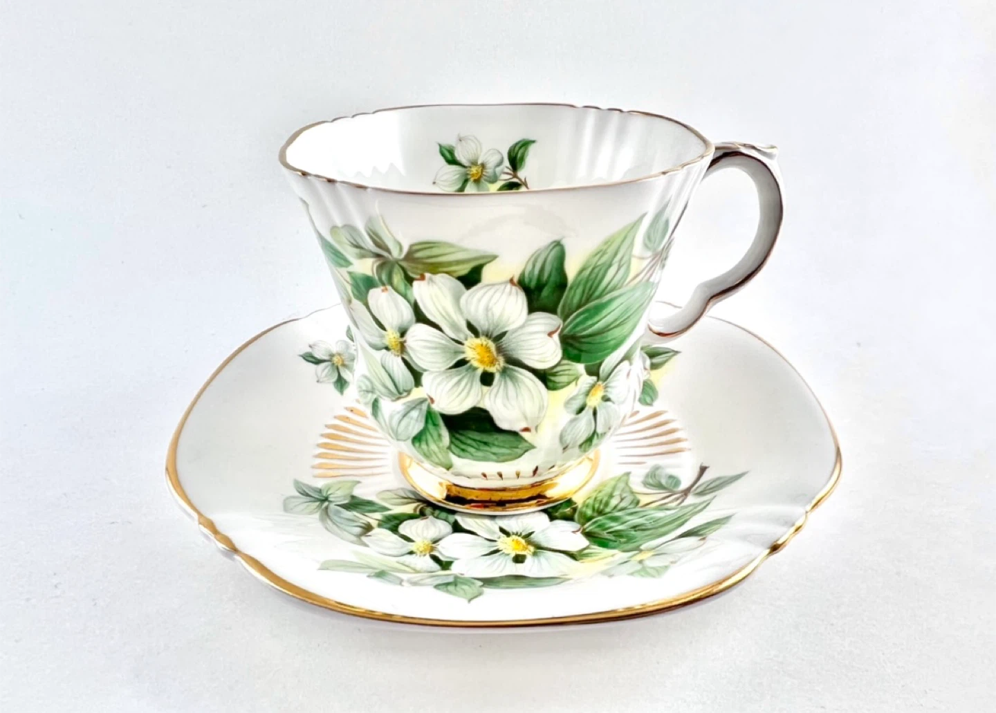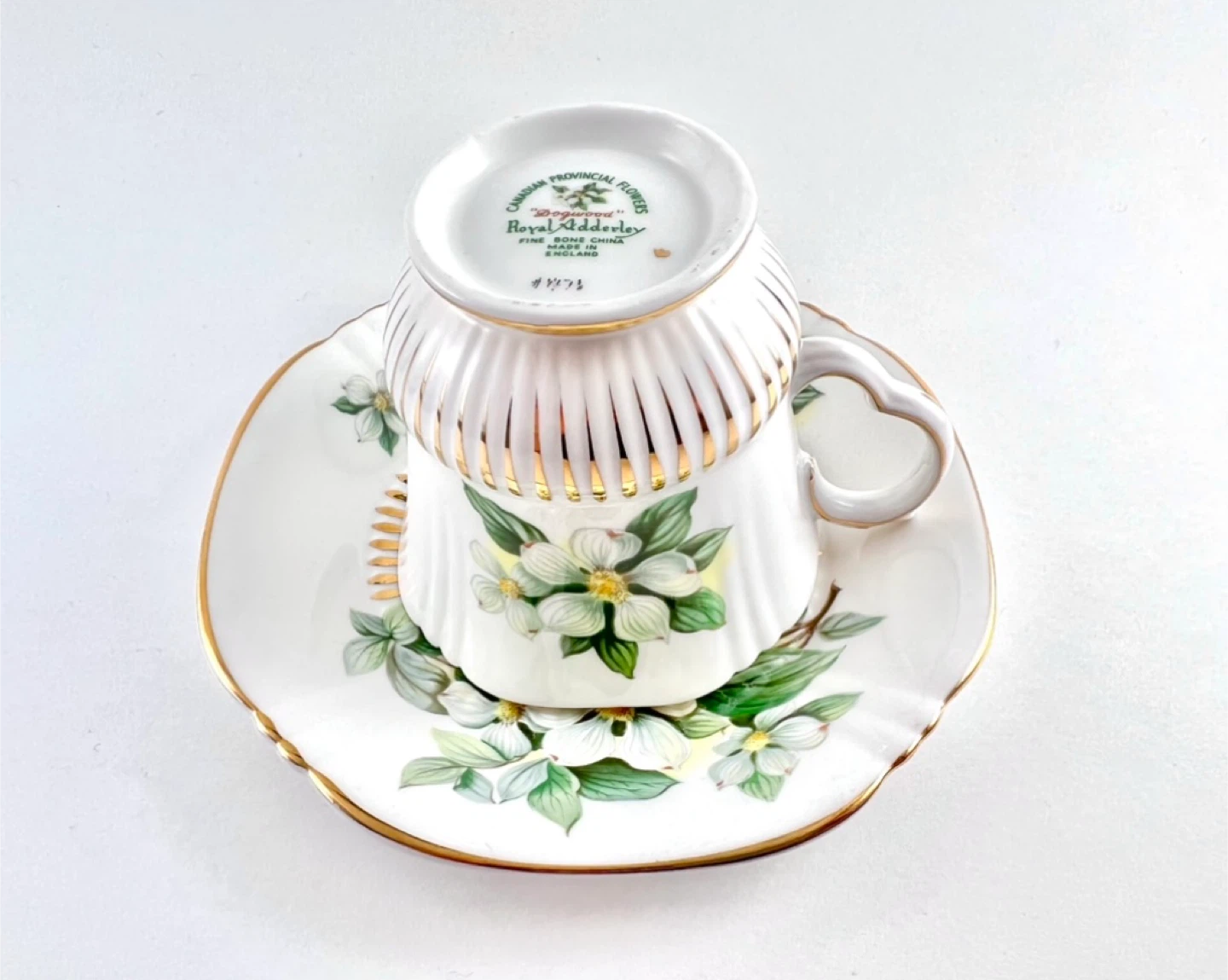 Royal Adderley fine bone china teacup, quatrefoil shape with dogwood flowers. No chips, cracks, crazing or gold loss — both pieces ping/ring