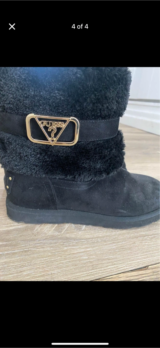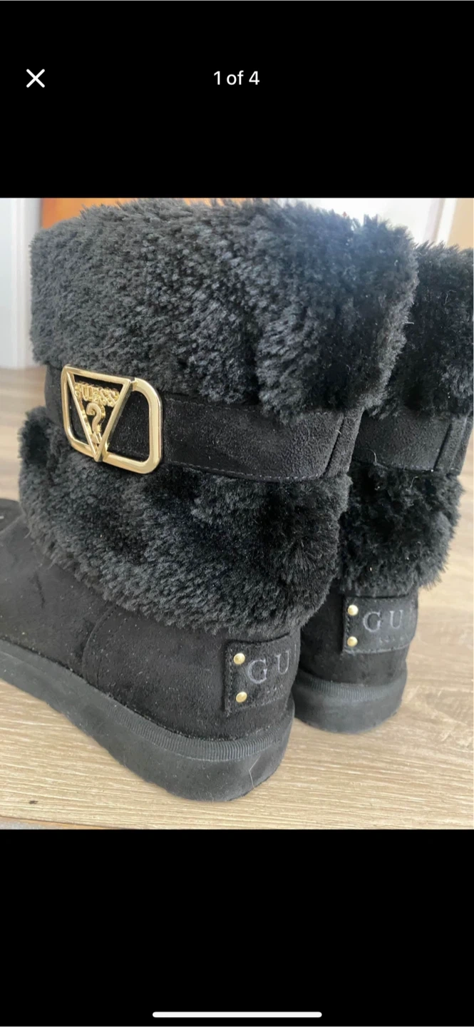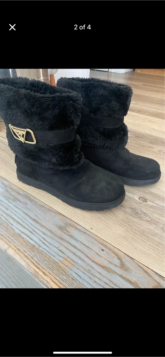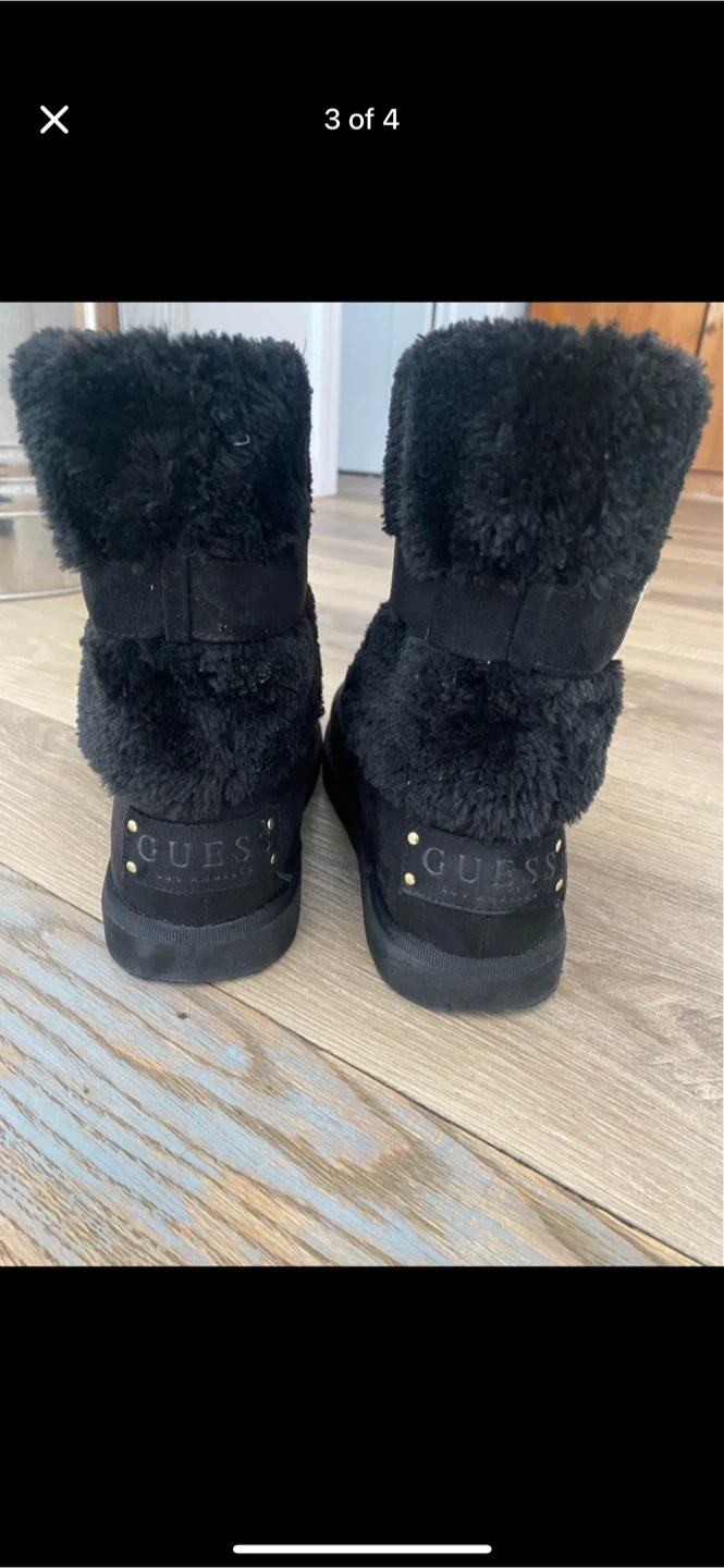 Cozy black winter boots from Guess! They have a faux fur trim and the Guess logo on the side. Perfect for keeping your feet warm and stylish this winter