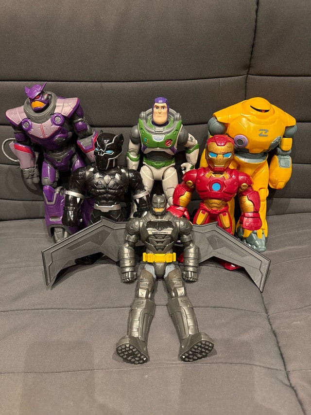 I'm selling a collection of used superhero action figures that includes popular characters such as Batman, Black Panther, Iron Man, Buzz Lightyear and Zurg from Lightyear, and a yellow robot. These figures are in good condition and are perfect for collectors or kids who love imaginative play. Although these heroes have seen some action, their superpowers are still fully charged, ready for their next adventure in a new home! Grab them before they fly off to another galaxy! All for $5 !