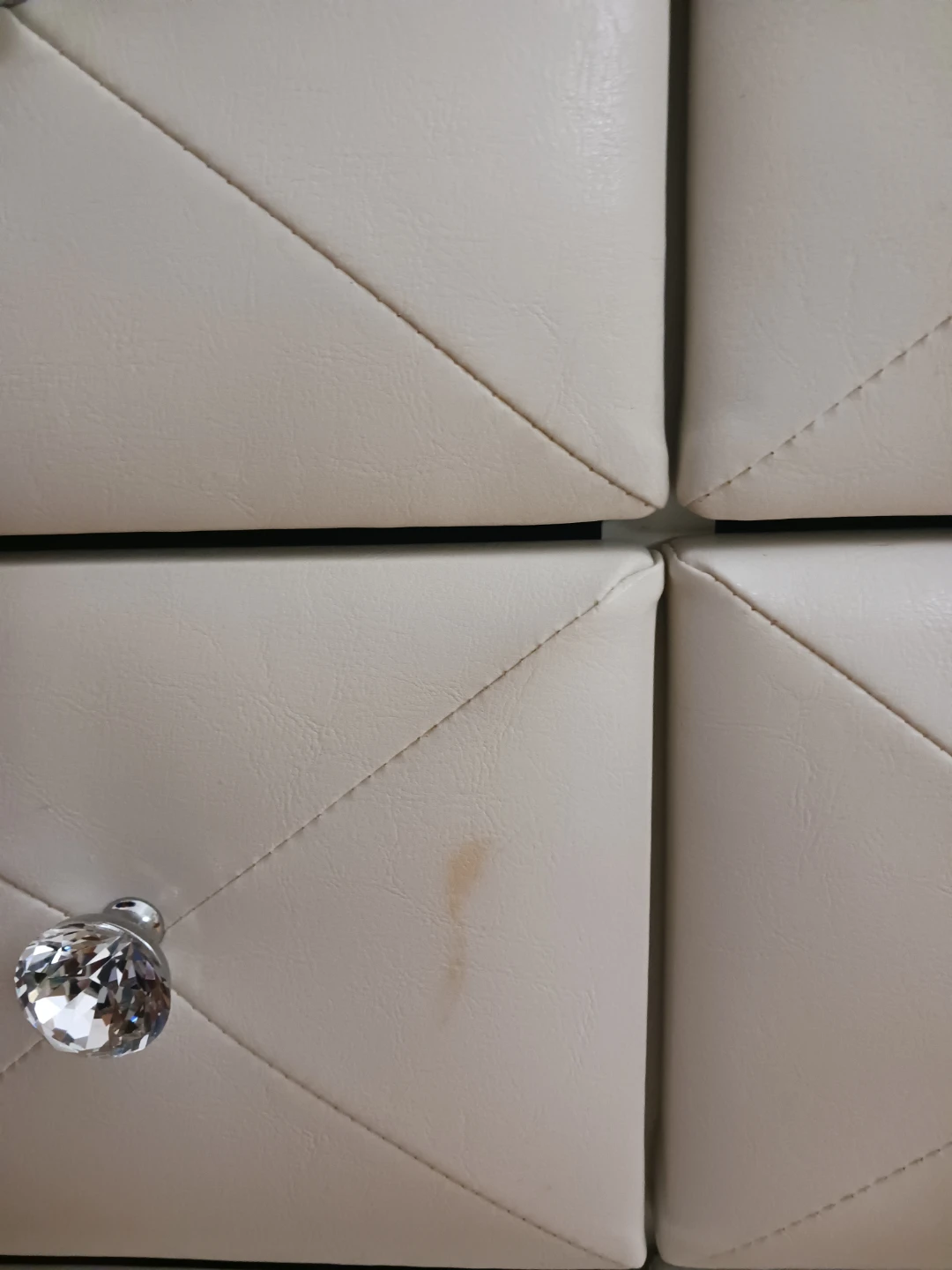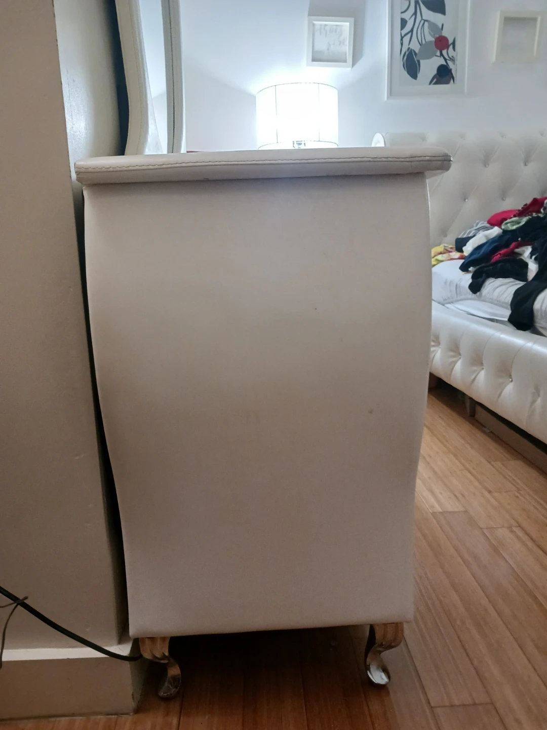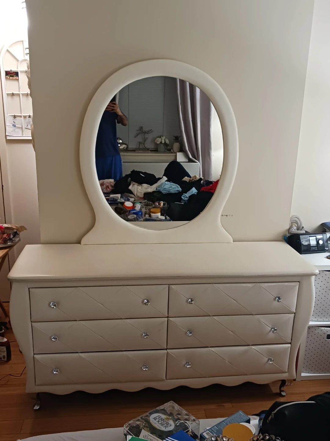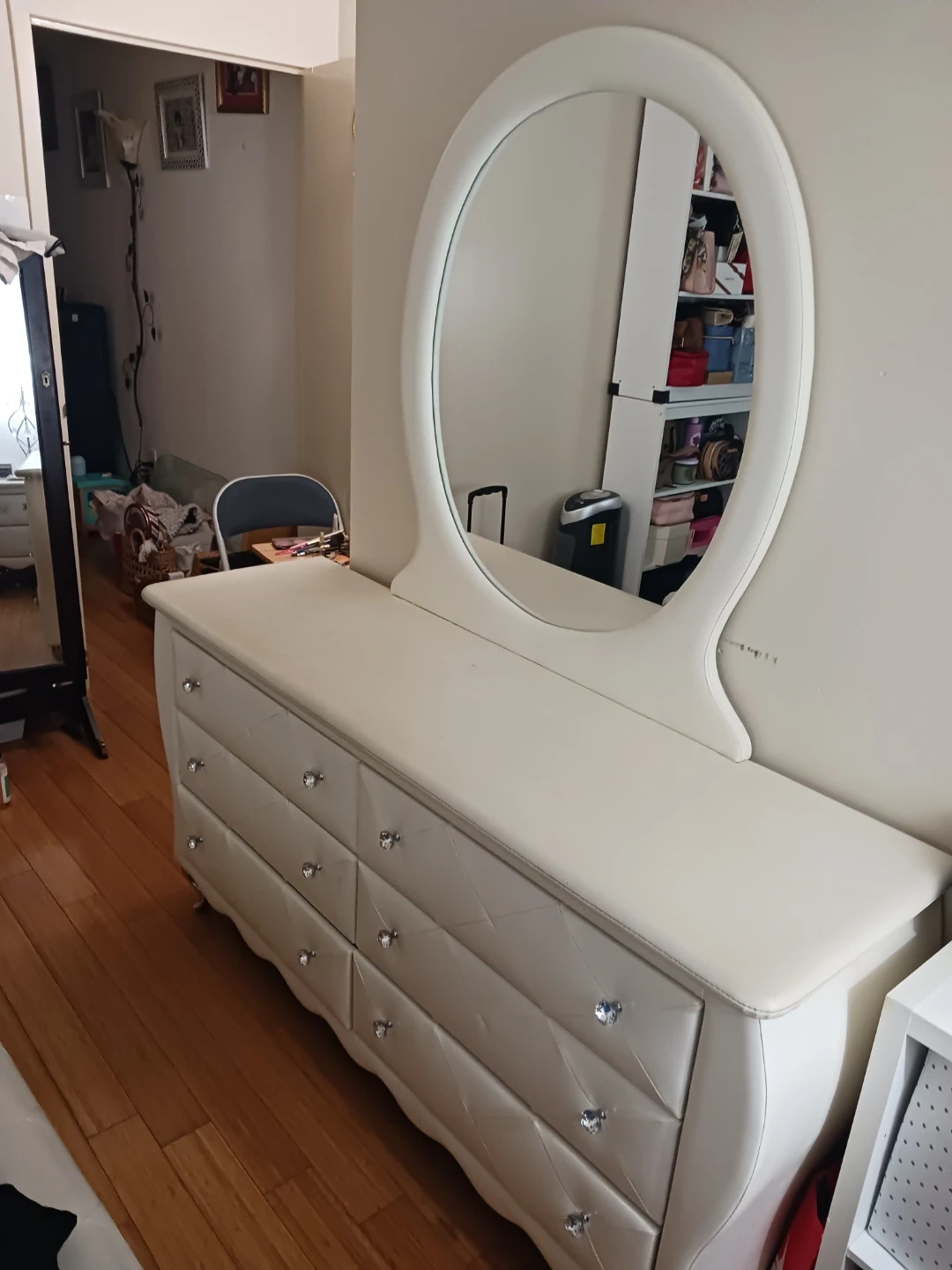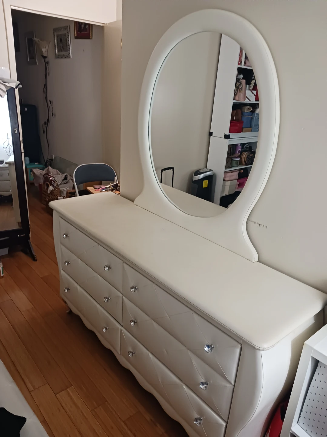 Cream-colored dresser with attached mirror and six drawers. Features diamond-pattern drawer fronts with diamond-style crystal handles. Solid and heavy piece. All drawers open and close properly. Mirror is intact with no cracks.