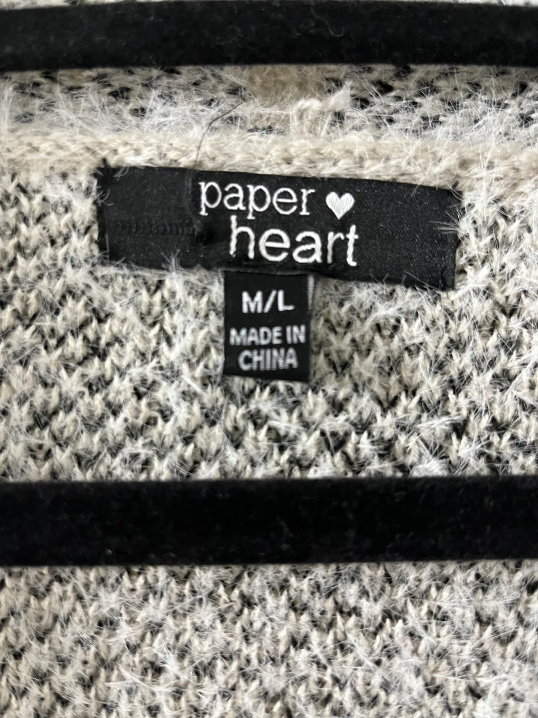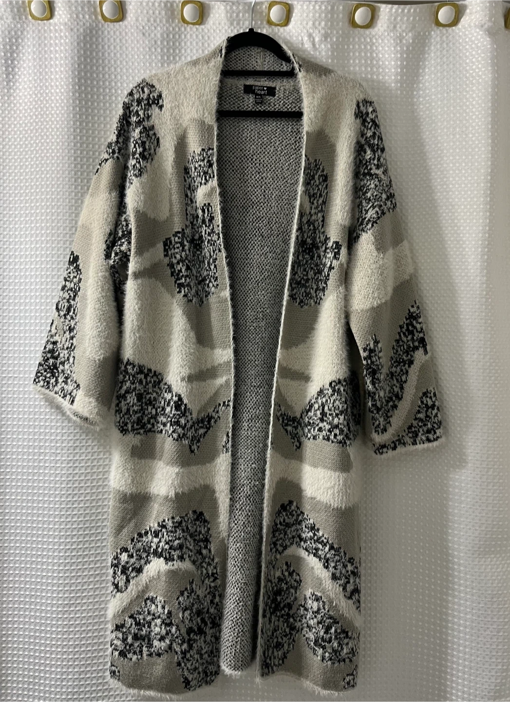 Cozy up in this Paper Heart cardigan! It's a size M/L and features a blend of 53% polyester and 47% acrylic for a soft and comfortable feel. Has pockets!