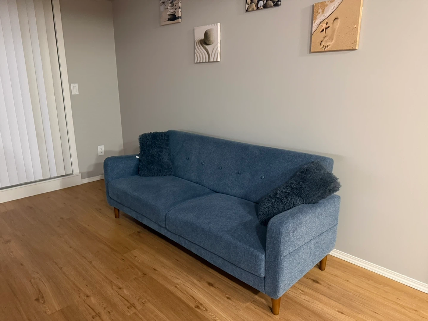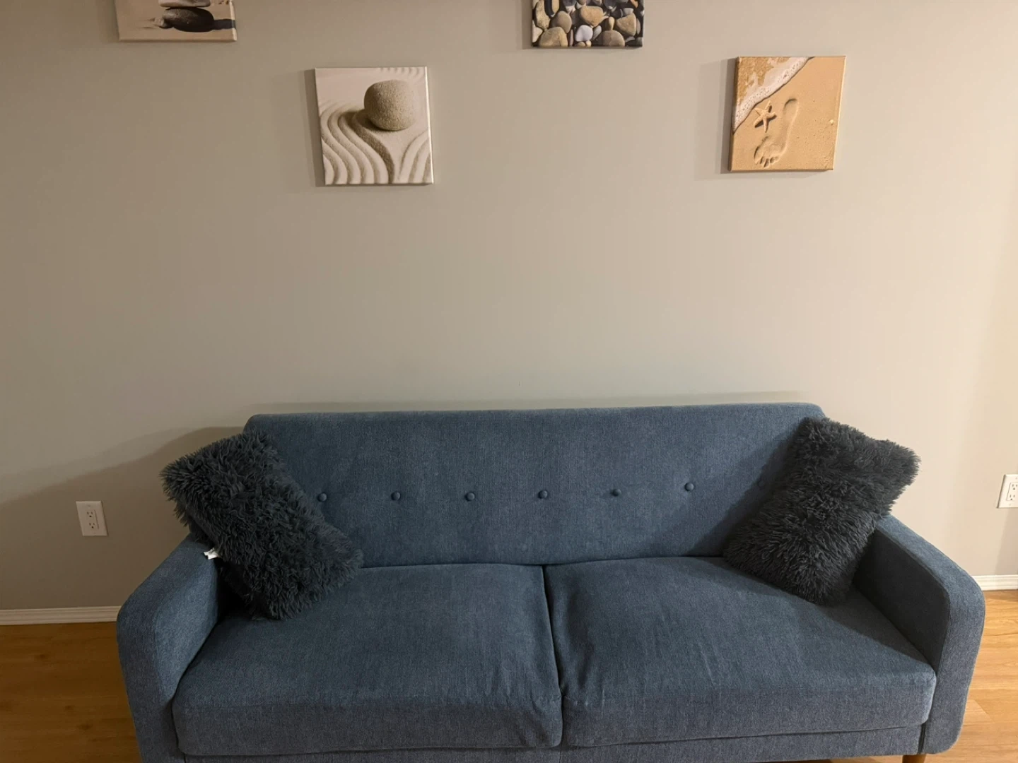 Selling a comfy blue fabric sofa! It's in great condition and would look great in any living room. The colour is a nice muted blue, and the fabric has a nice texture. It's a great size for apartments or smaller living spaces