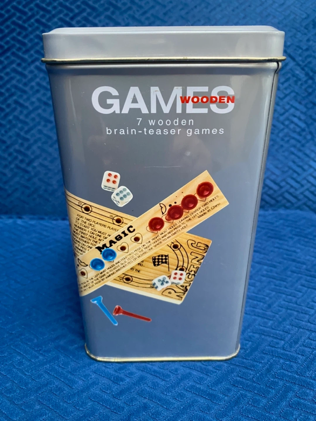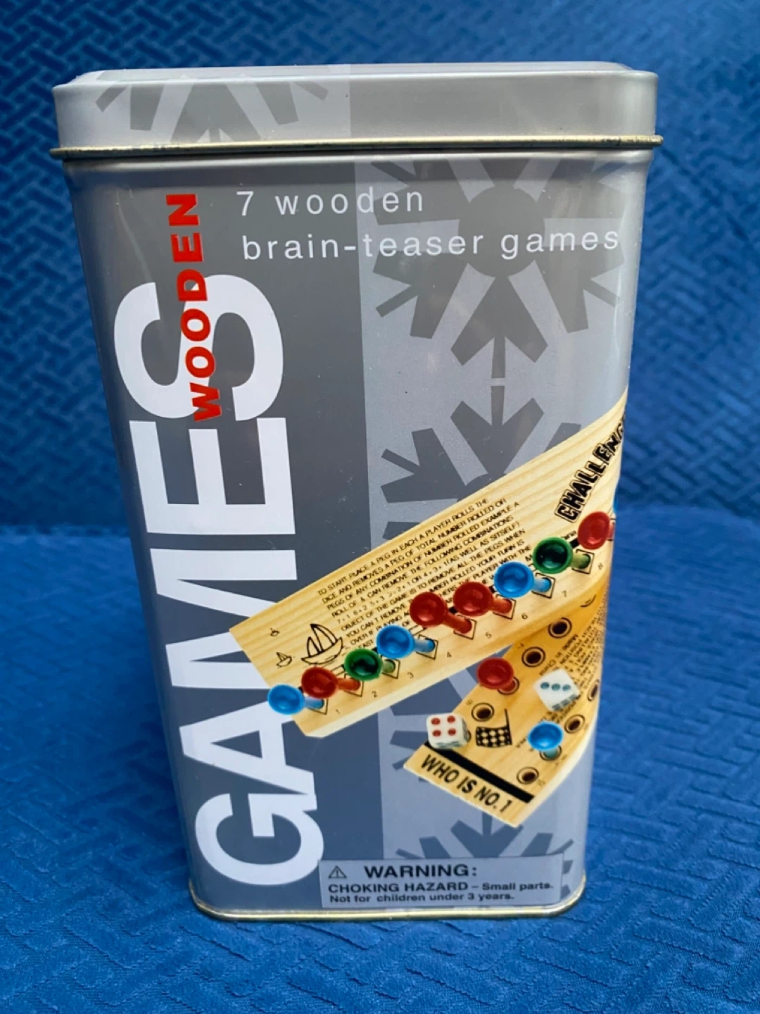 Selling a set of 7 wooden brain-teaser games! They come in a tin storage container and include instructions for each game. Perfect for some challenging fun!