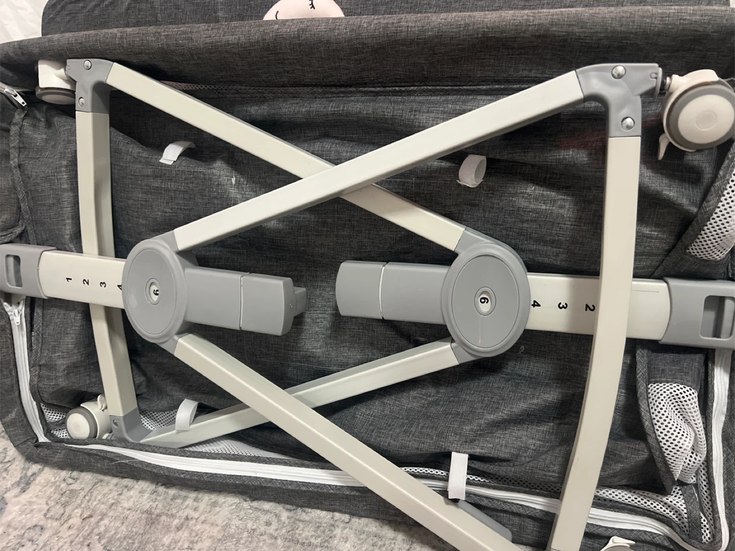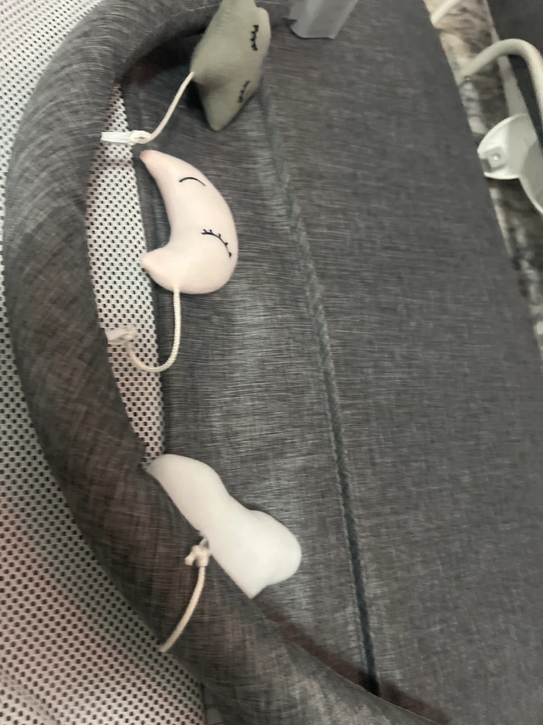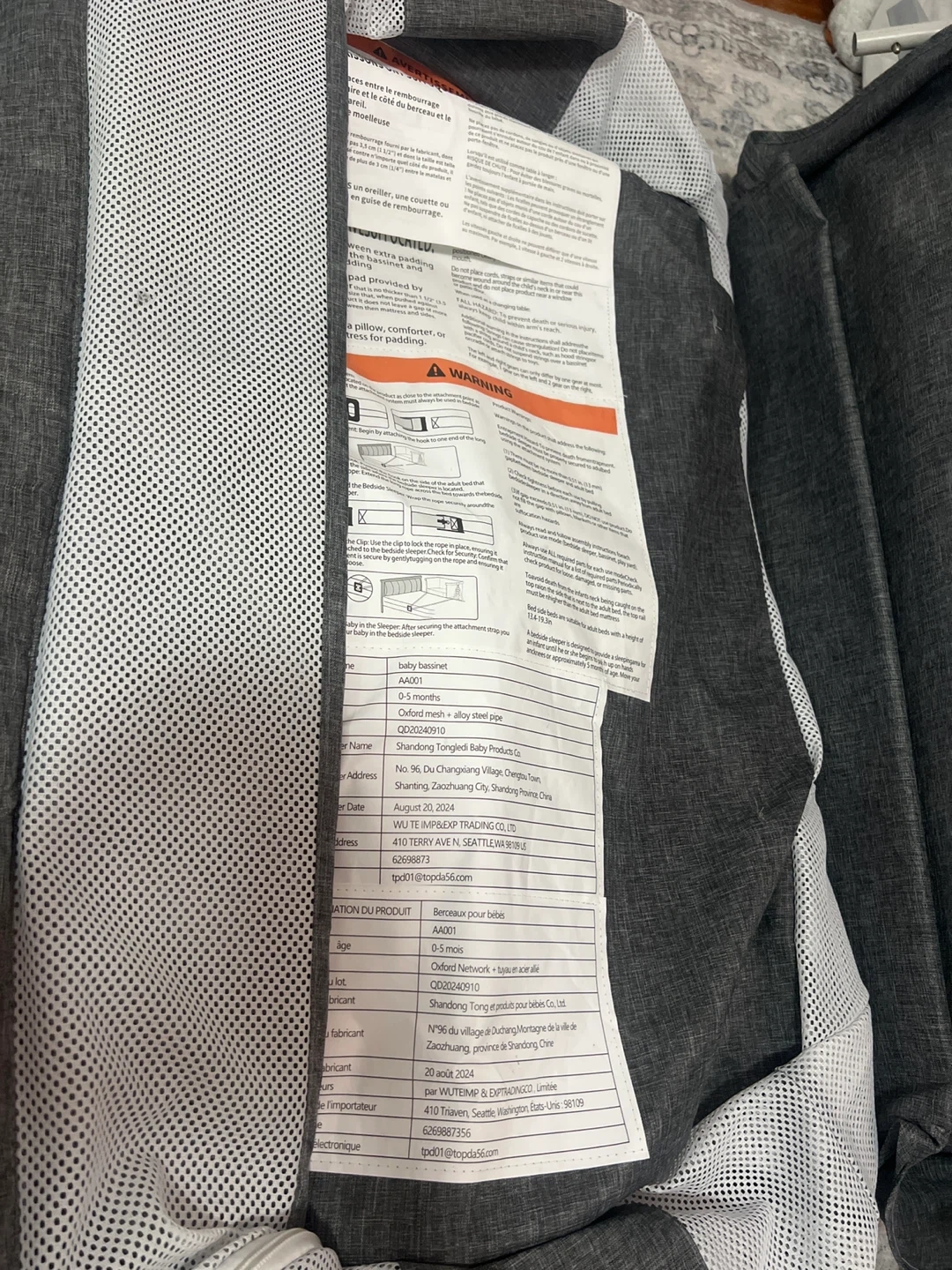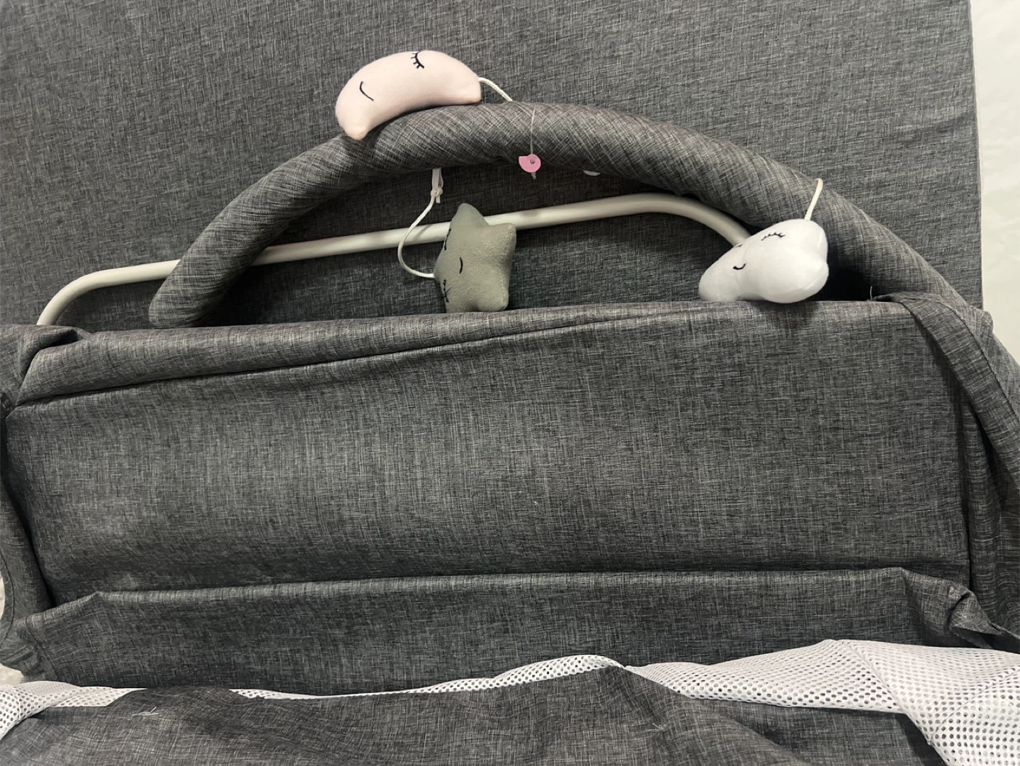 Selling a Shangdong Tongdawei baby bassinet in a stylish gray color! It's in great condition and perfect for newborns to around 5 months old. It features a sturdy alloy steel pipe frame for safety and durability. The bassinet also includes adorable hanging toys to keep your little one entertained