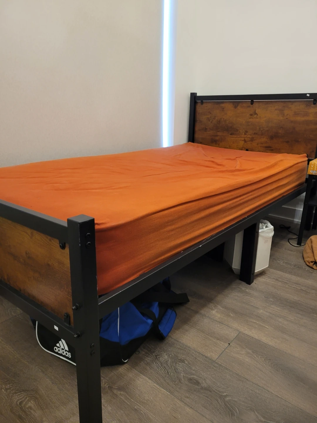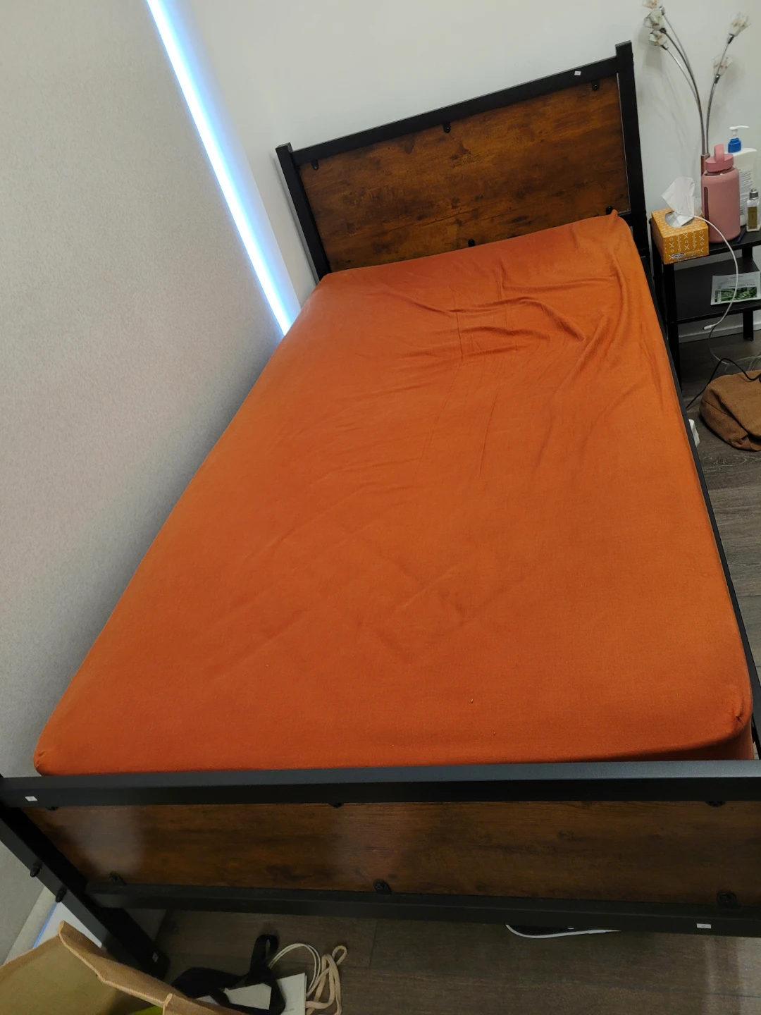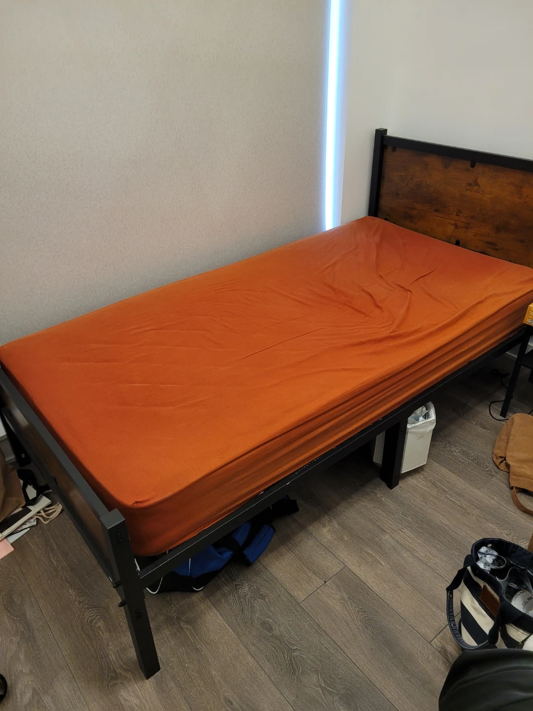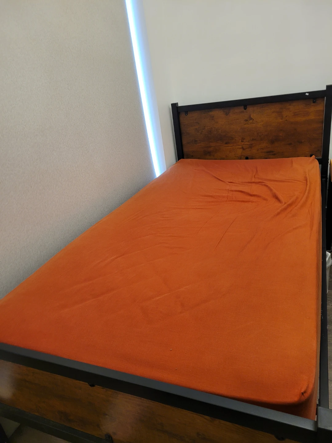 Selling a sturdy bed frame with a wood headboard and black metal frame. It's in great shape and fits a Twin size mattress perfectly.