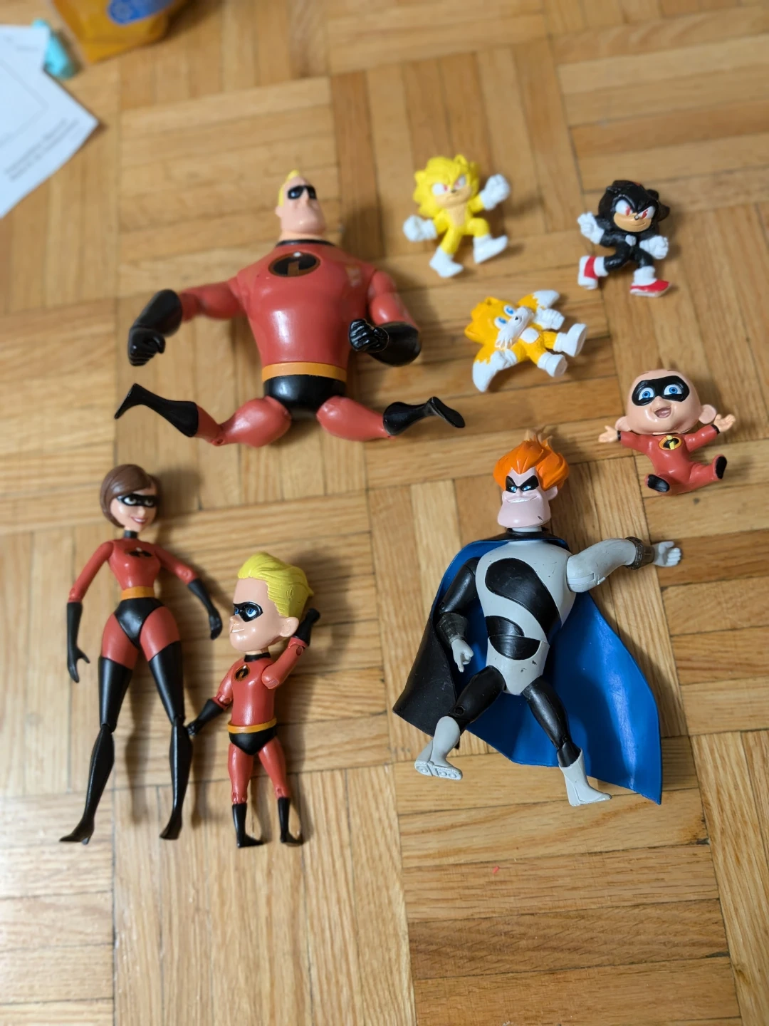 Selling a collection of action figures including characters from The Incredibles and Sonic the Hedgehog. They're in good condition and ready for a new home with a collector or a kiddo who loves these characters!
