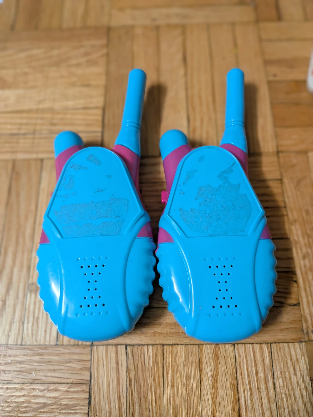Selling a set of kids' walkie talkies! They're blue and pink, and ready for some fun adventures. They show signs of use. Some wear and tears. Perfectly working, best for two kids in a house.