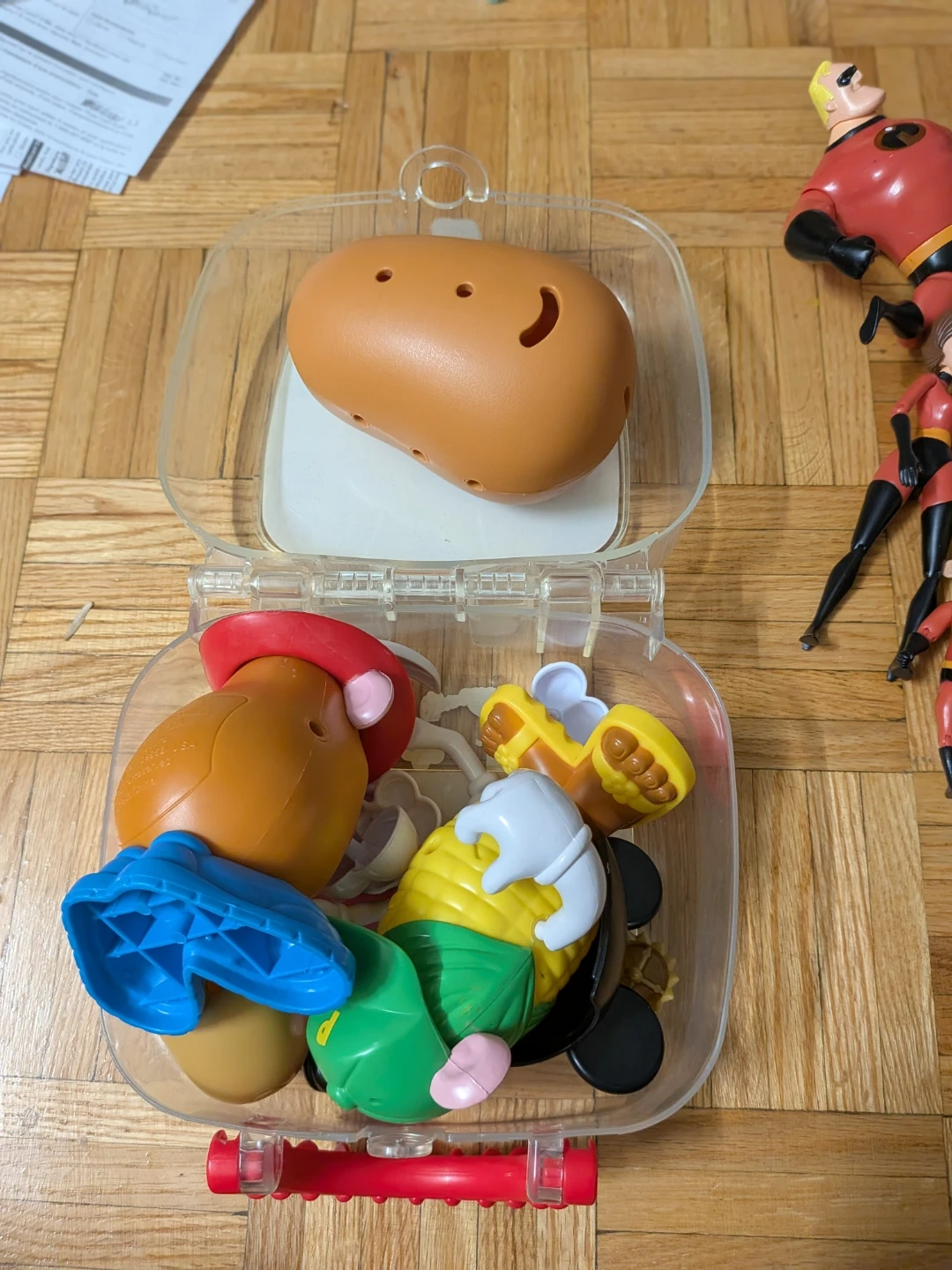 Selling a mixed lot of toys! Includes a dinosaur egg, Mr. Potato Head pieces, a LeapFrog vacuum, and a Fisher-Price barn. As it is barn animals are missing. Change battery for vacuum.