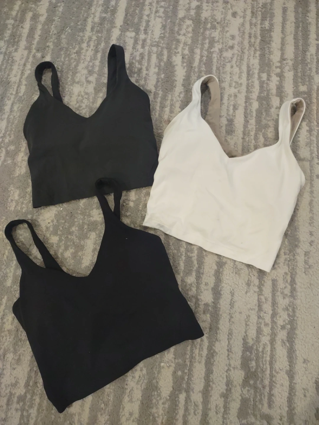 Selling these 3 Lululemon Align tank tops! Available in black,white and dark grey. Originally each one was 68$. for all 3 60$, for 1 25$. Some have been worn more than others. The black and white ones are both size 4, the dark grey is size 2.