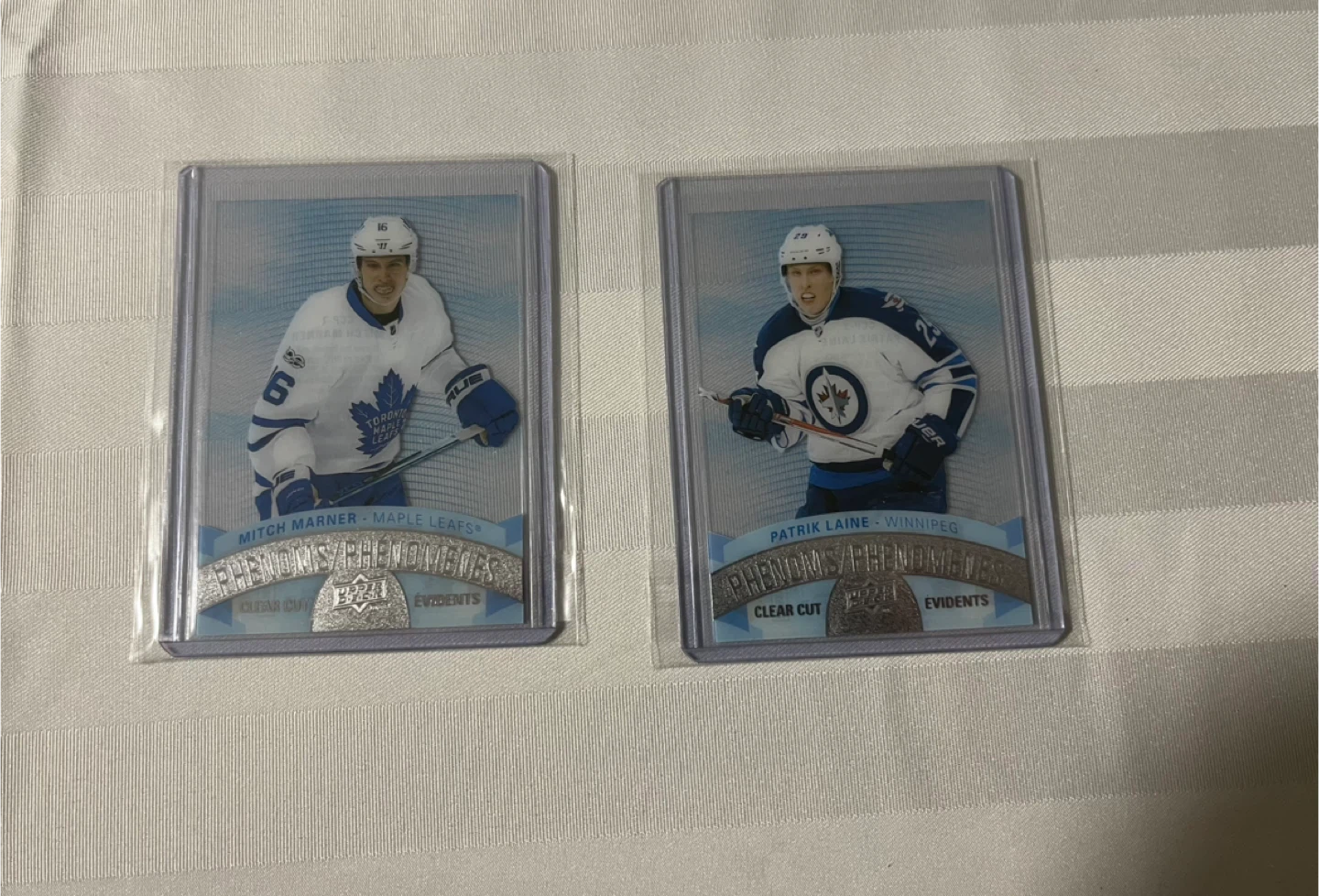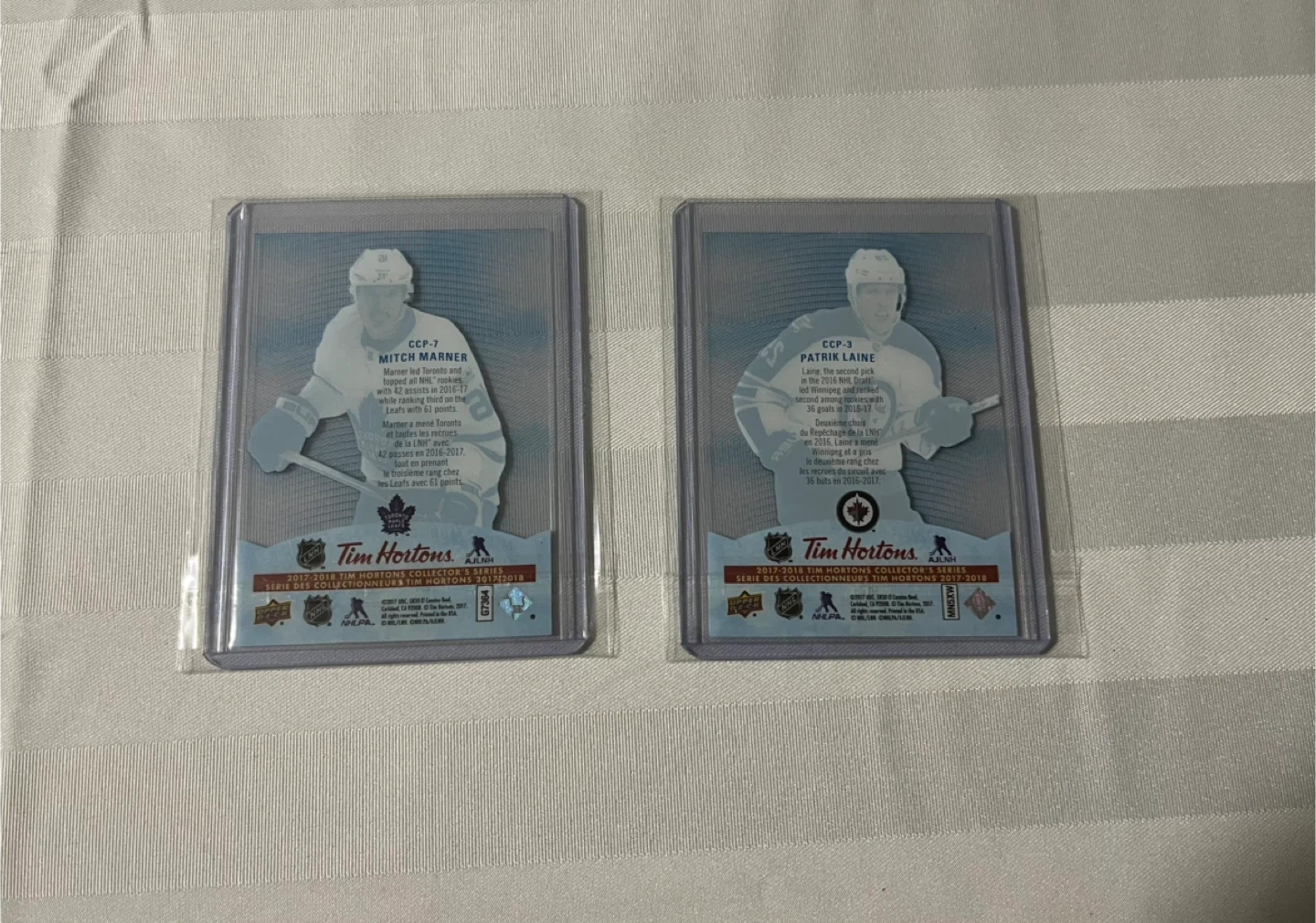 Selling two Tim Hortons hockey cards featuring Mitch Marner of the Toronto Maple Leafs and Patrik Laine of the Winnipeg Jets. These cards are from the 2017-2018 Tim Hortons Collector's Series.