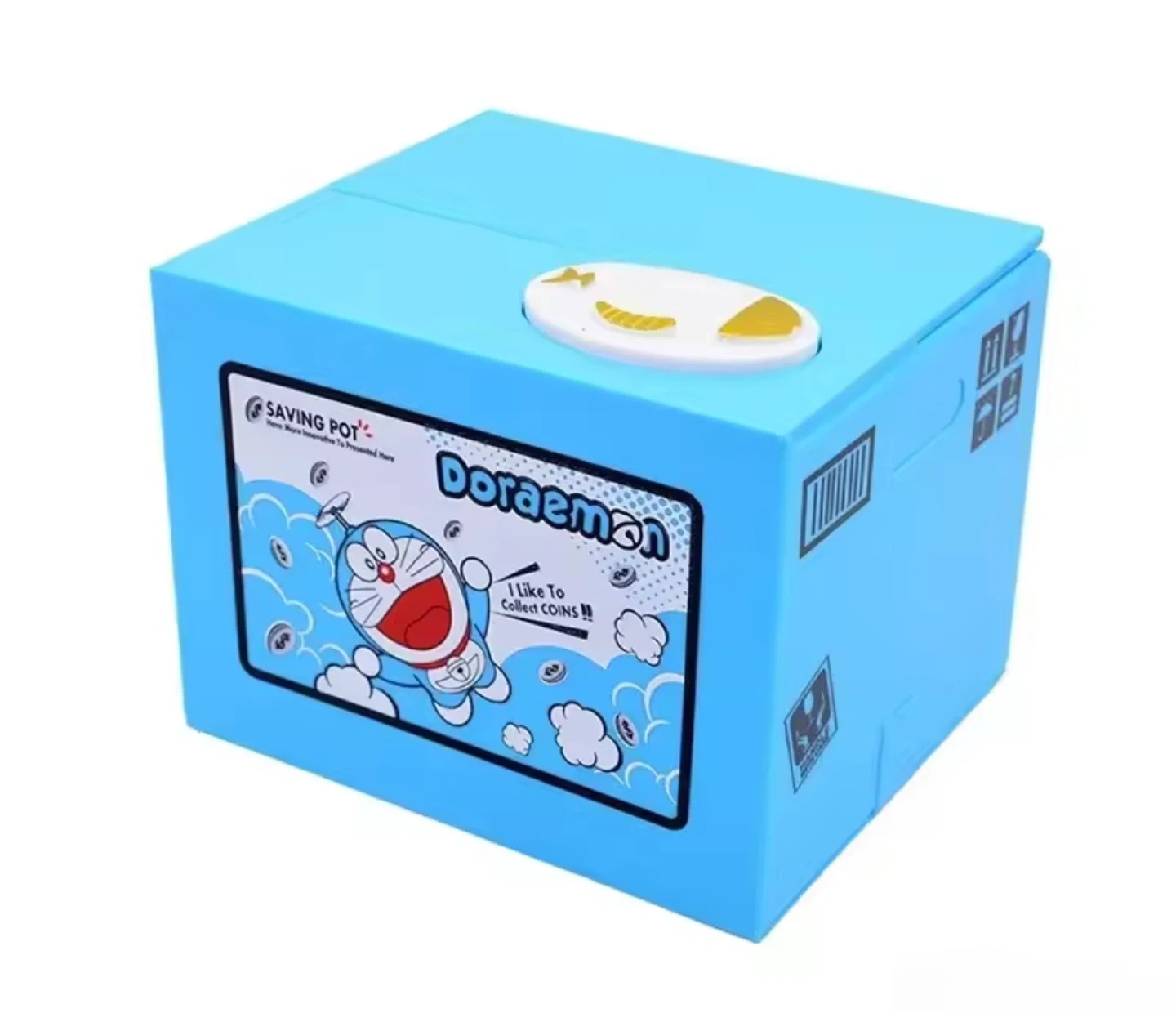 This is a Doraemon themed coin bank or saving pot. It's blue and features Doraemon graphics on the side. It's a fun way to save your coins!