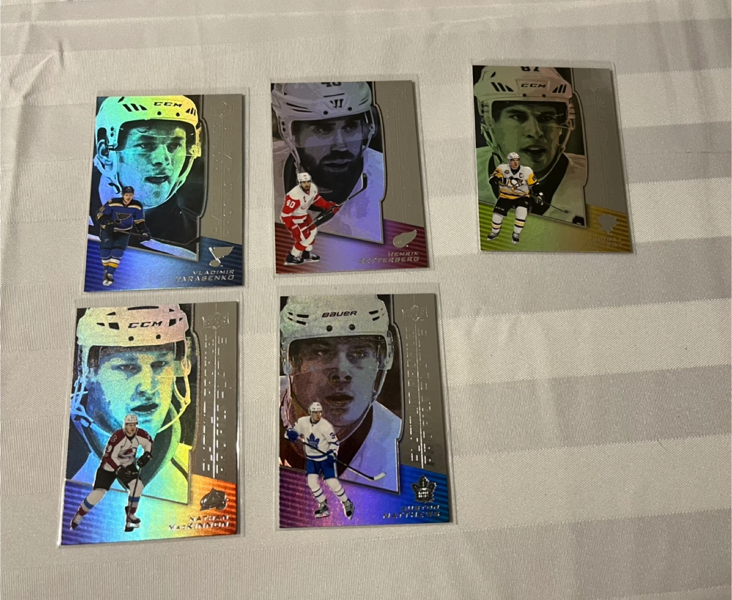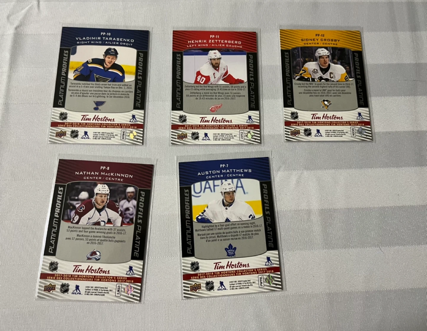 Selling a set of 2017-2018 Tim Hortons hockey cards! These cards are from the Platinum Profiles series and feature players like Vladimir Tarasenko, Henrik Zetterberg, Sidney Crosby, Nathan MacKinnon, and Auston Matthews. Great for any hockey card collector!
