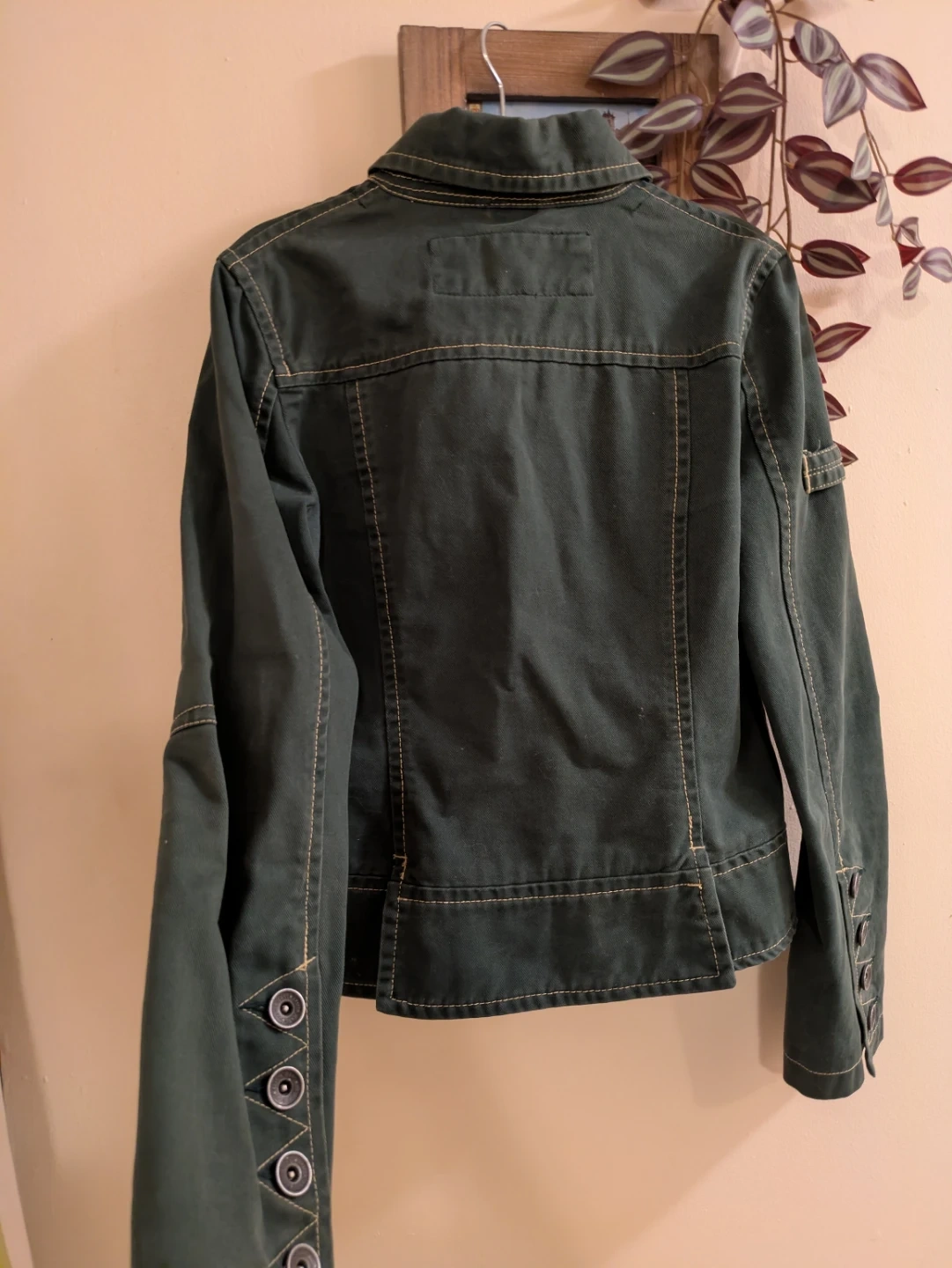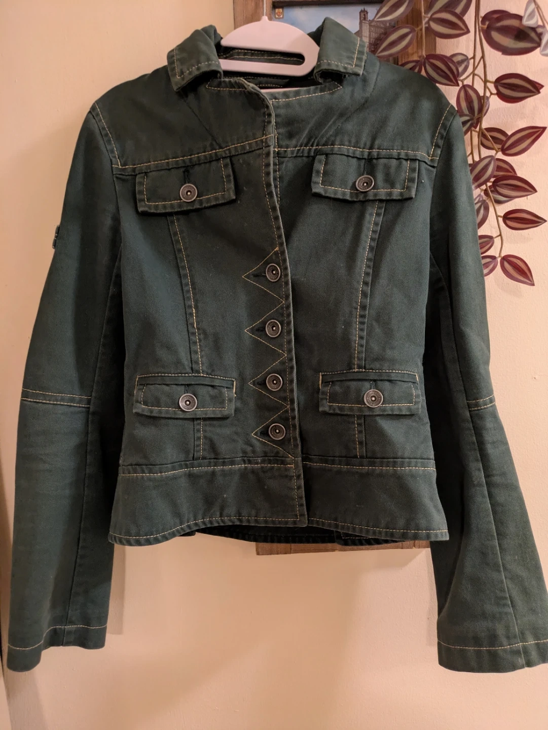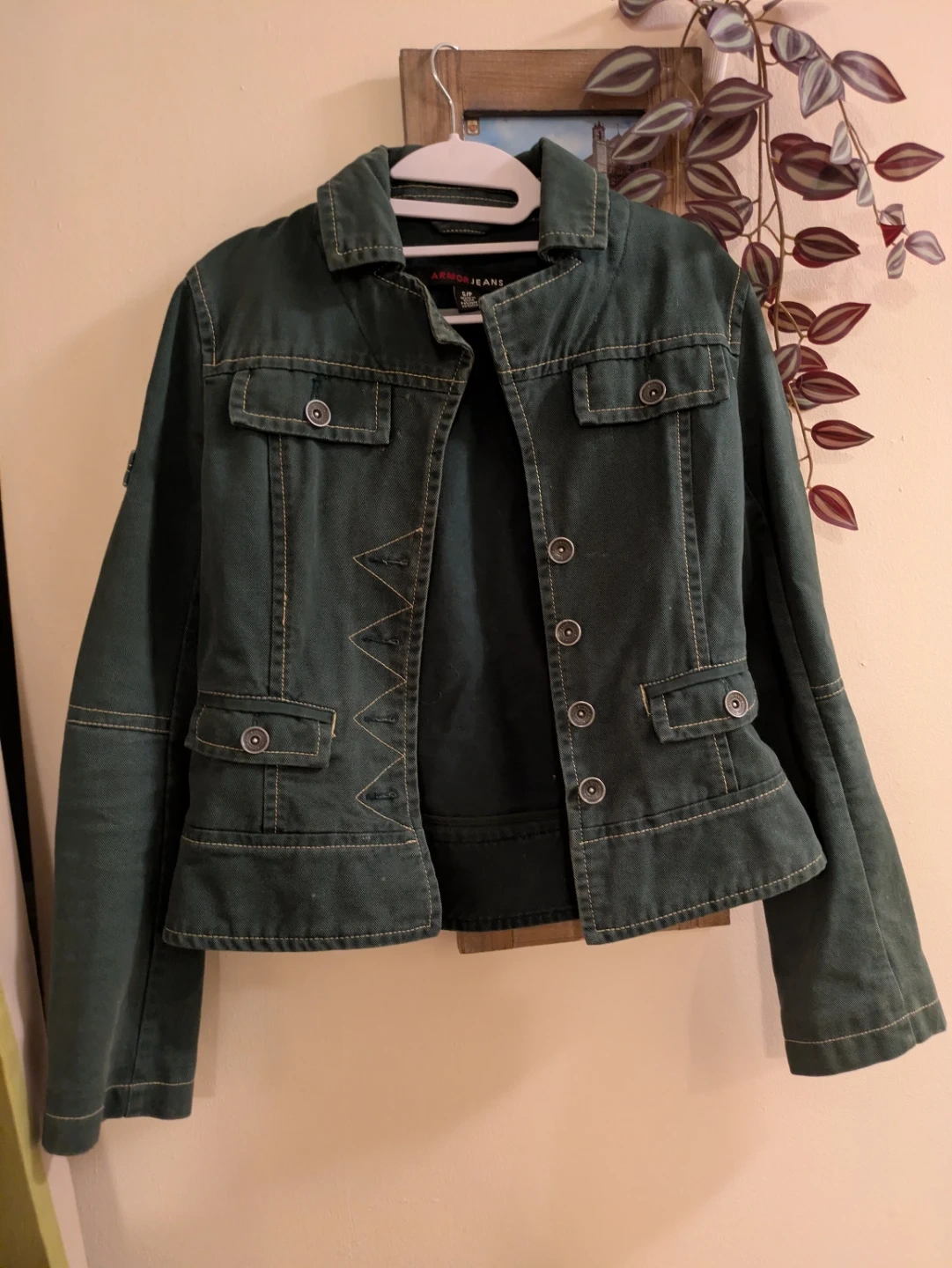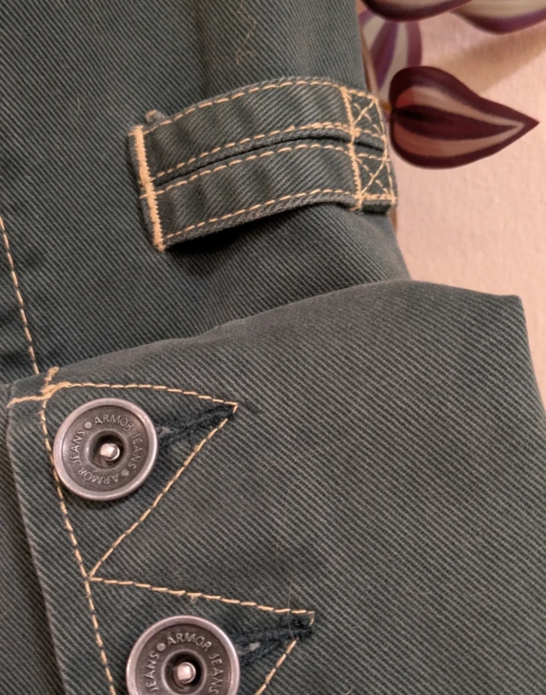 Here's a stylish green jacket from Armor Jeans! It features a unique design with detailed stitching and button accents. Perfect for adding a touch of flair to your wardrobe