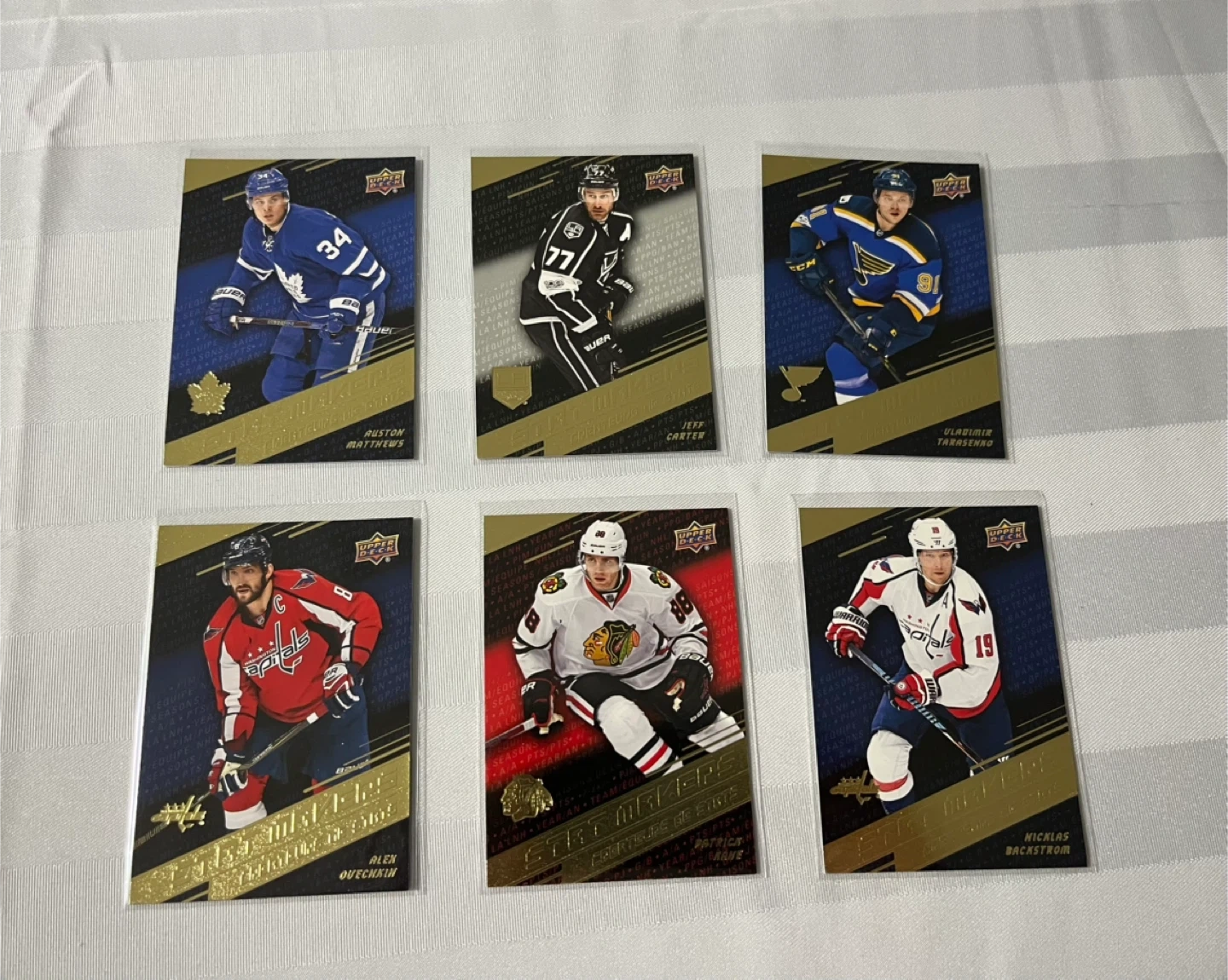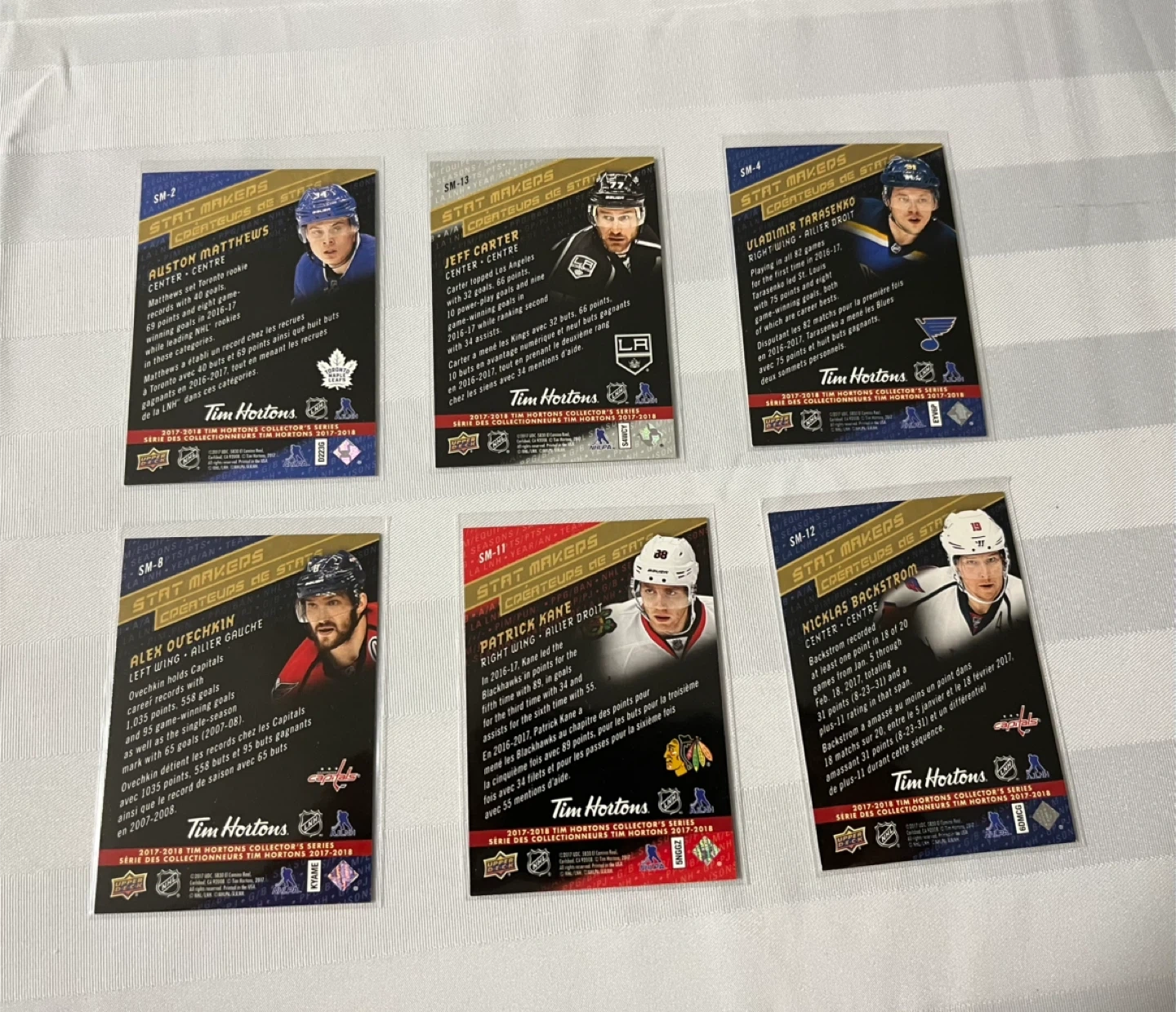 Selling a set of Tim Hortons Stat Makers hockey cards from the 2017-2018 collection! Includes players such as Auston Matthews, Jeff Carter, Vladimir Tarasenko, Alex Ovechkin, Patrick Kane, and Nicklas Backstrom. These cards are in great condition and would be a fantastic addition to any hockey card collection!