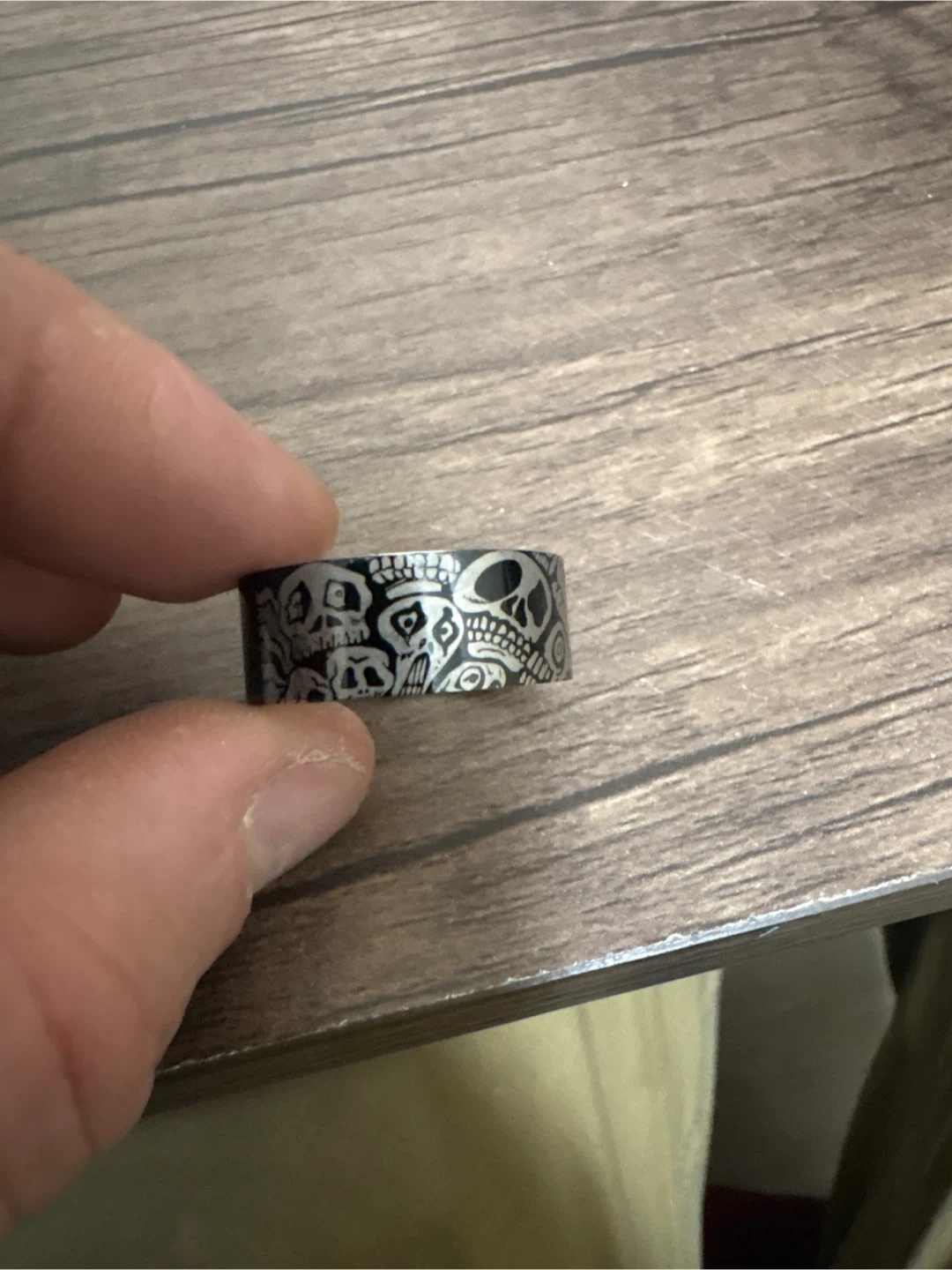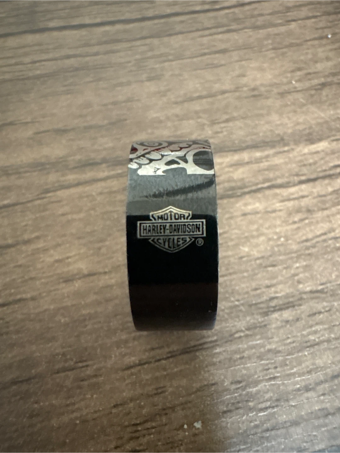 Selling a Harley-Davidson ring with a skull design! It's a cool accessory for any Harley enthusiast. The ring is black with silver-toned skull patterns and the Harley-Davidson logo. A great piece to add to your collection!