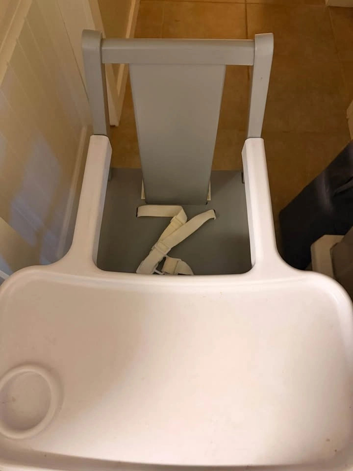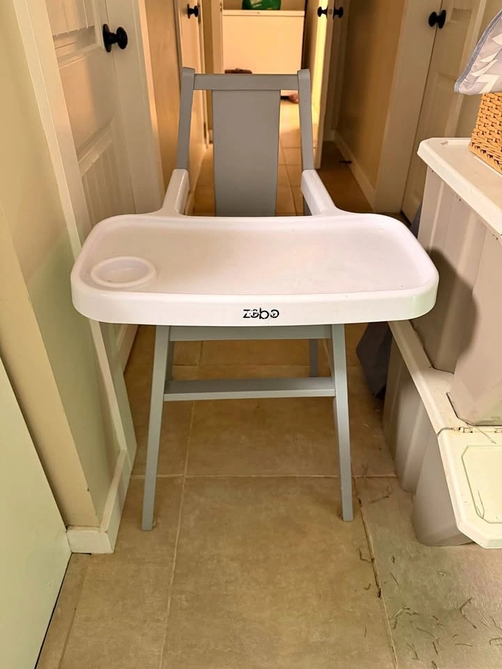 The tray is not removable, however it’s worked great for us. Has safety straps. Grey in colour.
