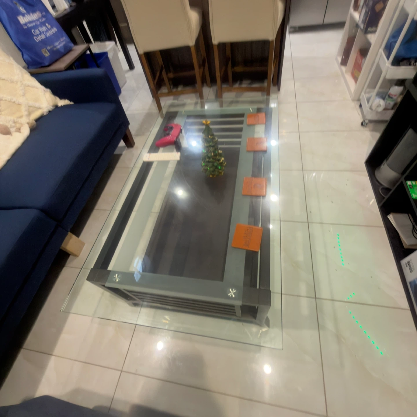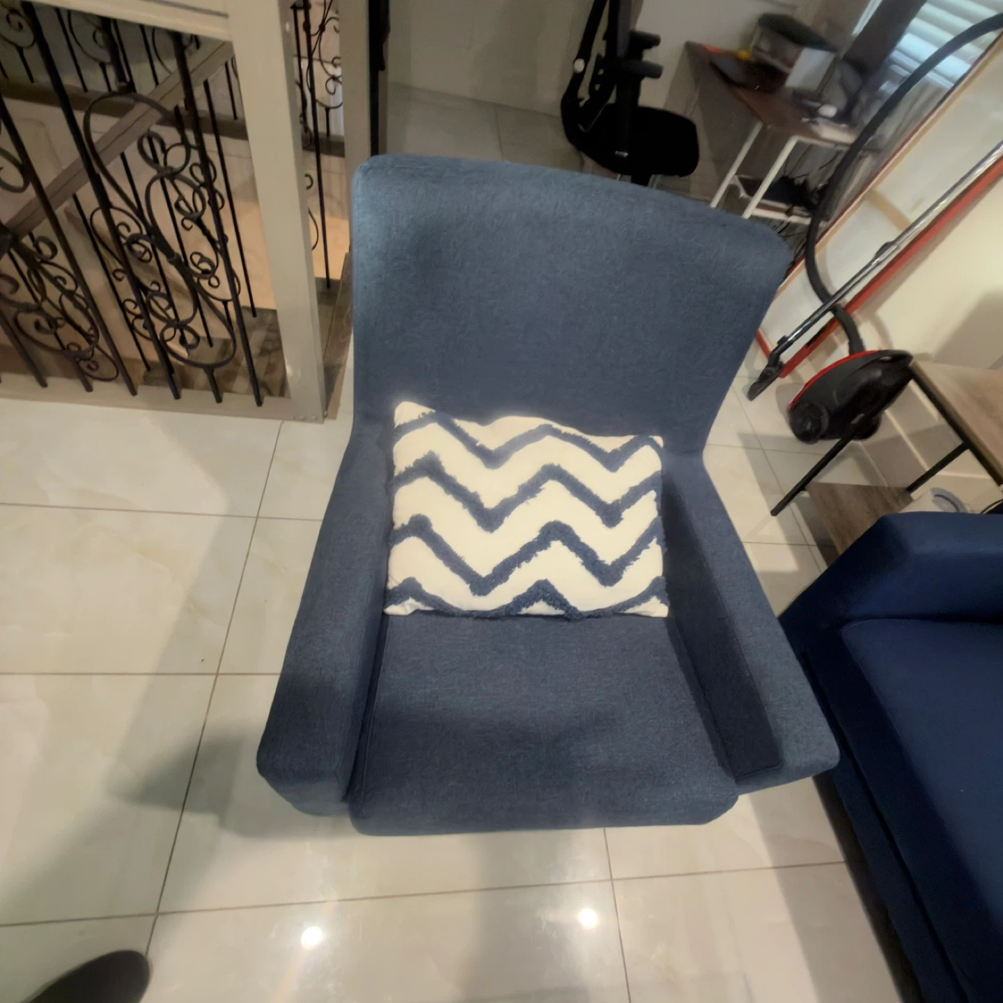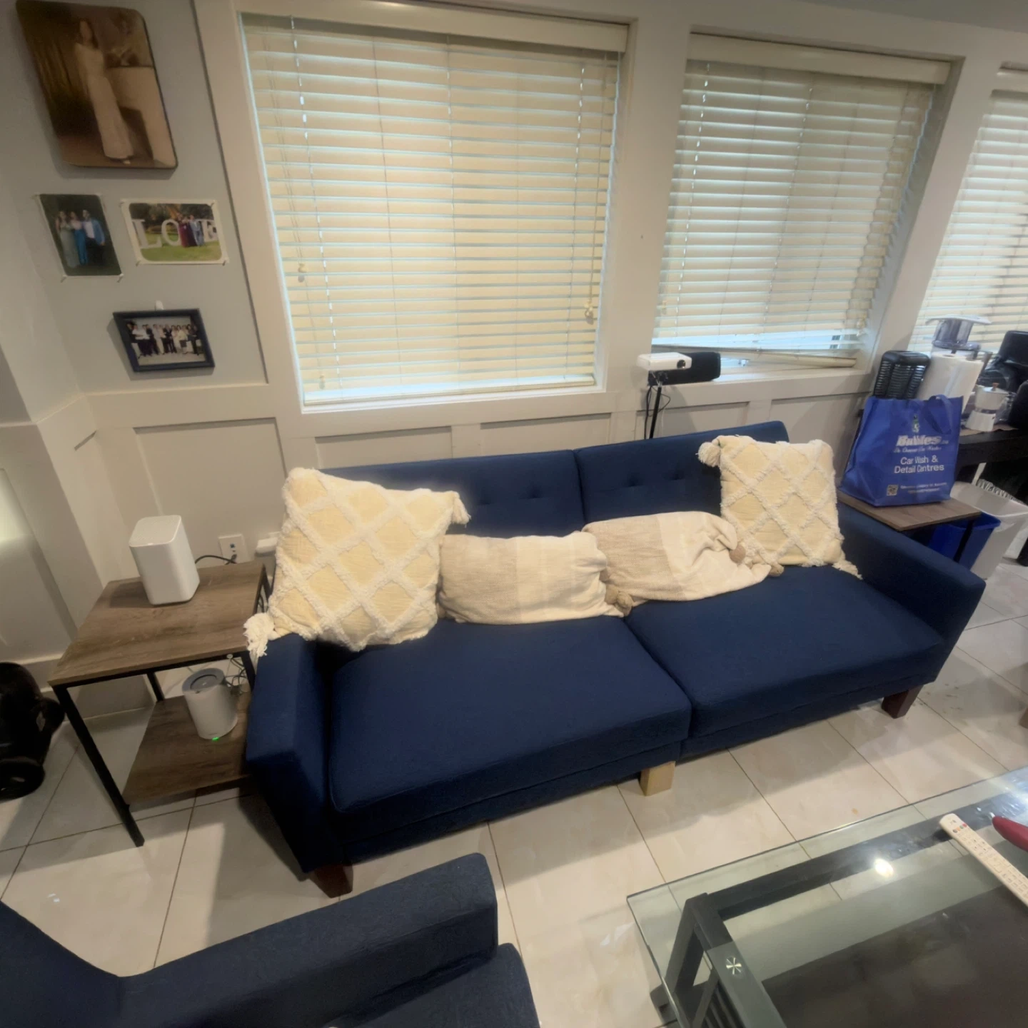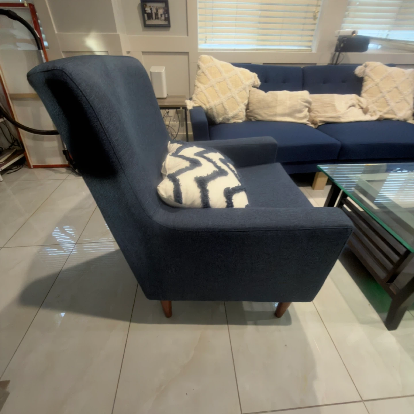 Blue Sofa, Glass Coffee Table and blue armchair