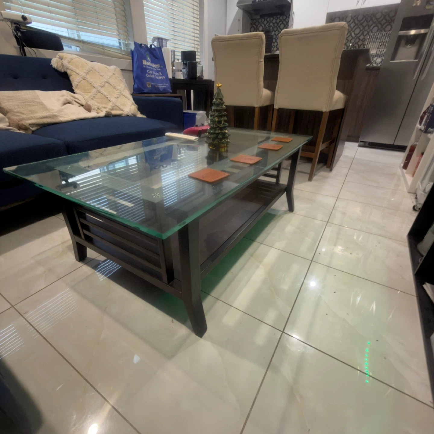 Selling a comfy blue sofa and a stylish glass coffee table. They're both in great shape and would look lovely in any living room. The blue armchair is also available!