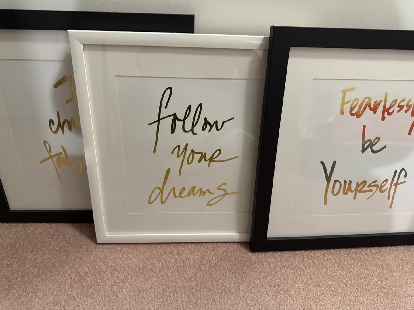 Selling a set of 3 framed wall art pieces. Each frame has a different inspirational quote in a stylish font. The frames are in black and white.