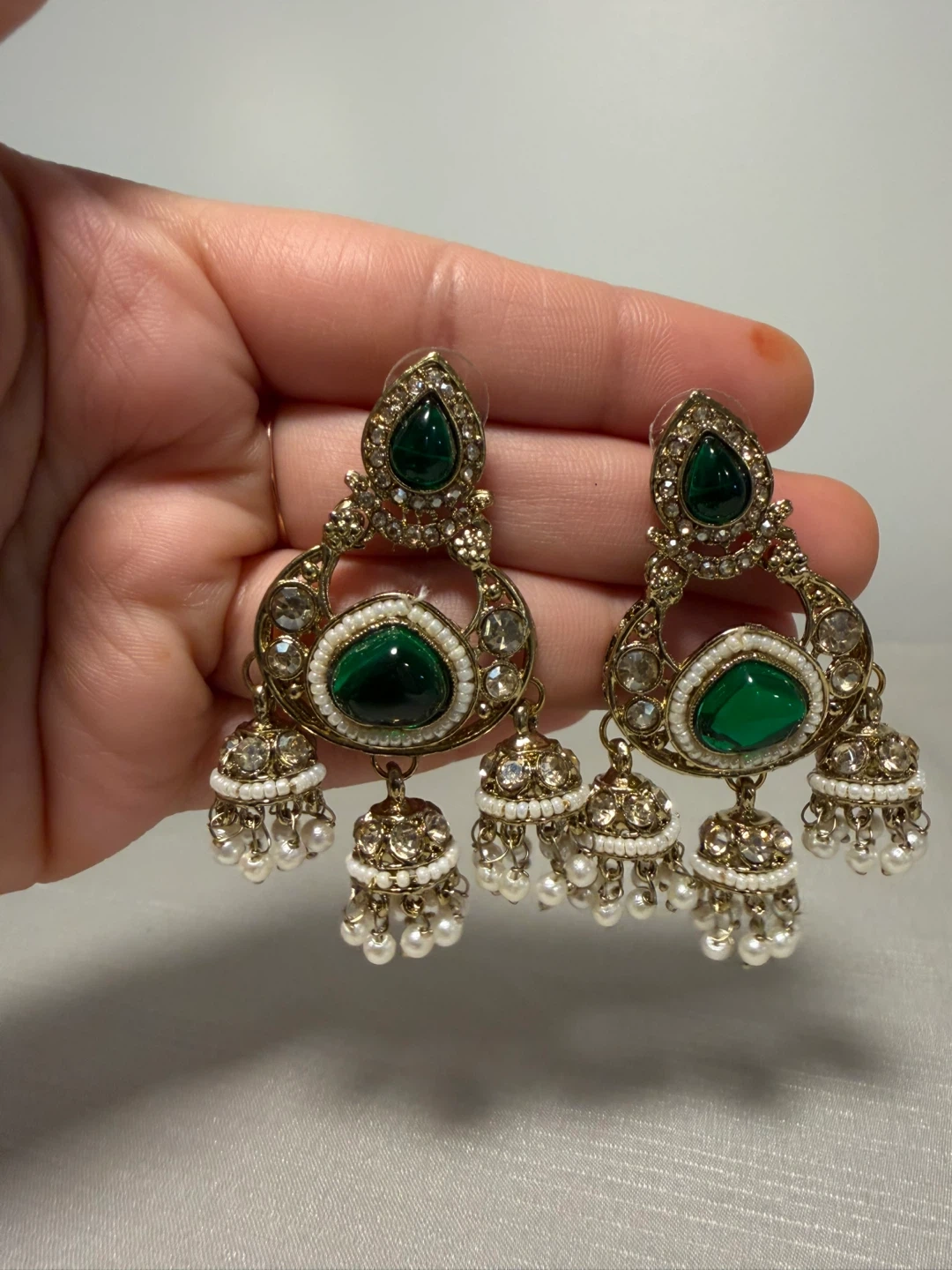 Beautiful pair of green and gold jhumka earrings. They have a lovely traditional design with faux pearls and green stones. Perfect for adding a touch of elegance to any outfit!