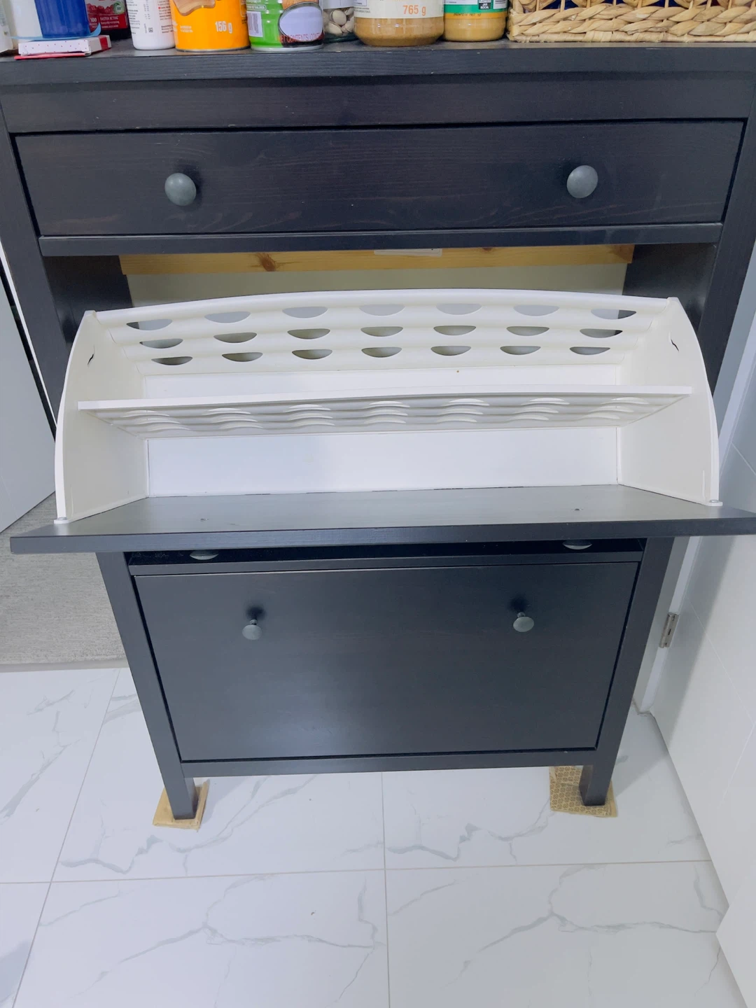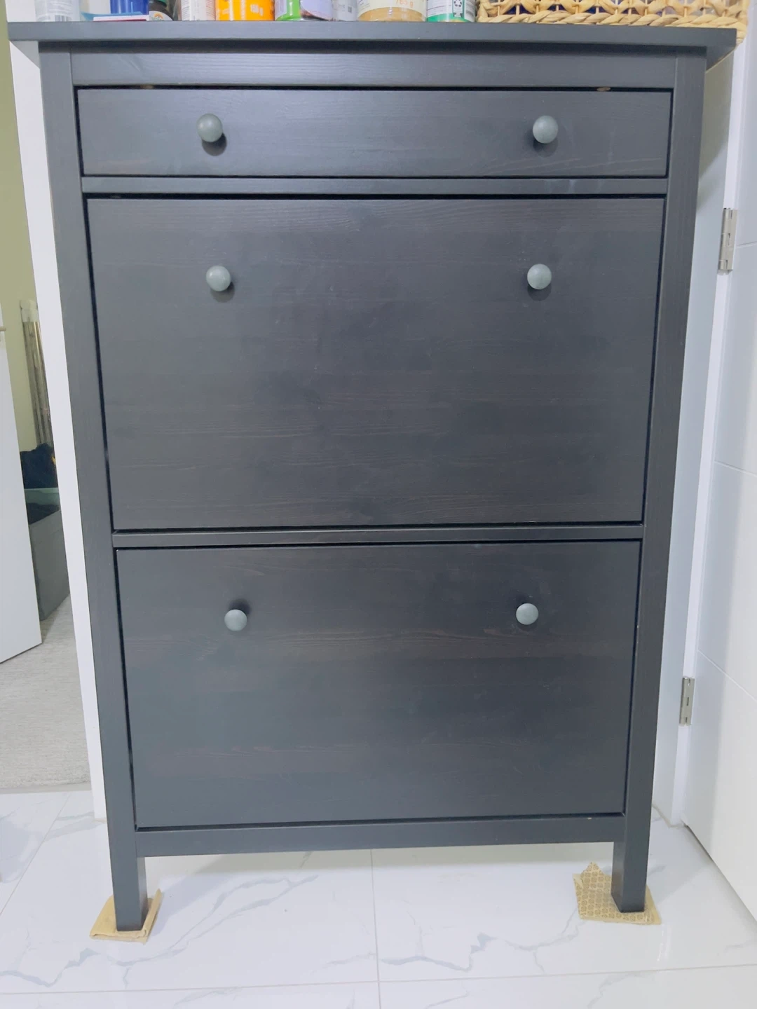 Selling a gently used IKEA Hemnes shoe cabinet in black-brown. This cabinet is perfect for keeping your entryway tidy and organized. It provides ample storage for shoes while taking up minimal space. It's in great condition and ready for a new home!