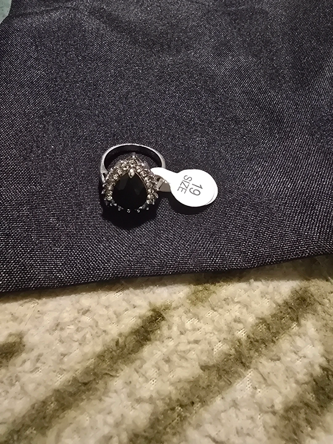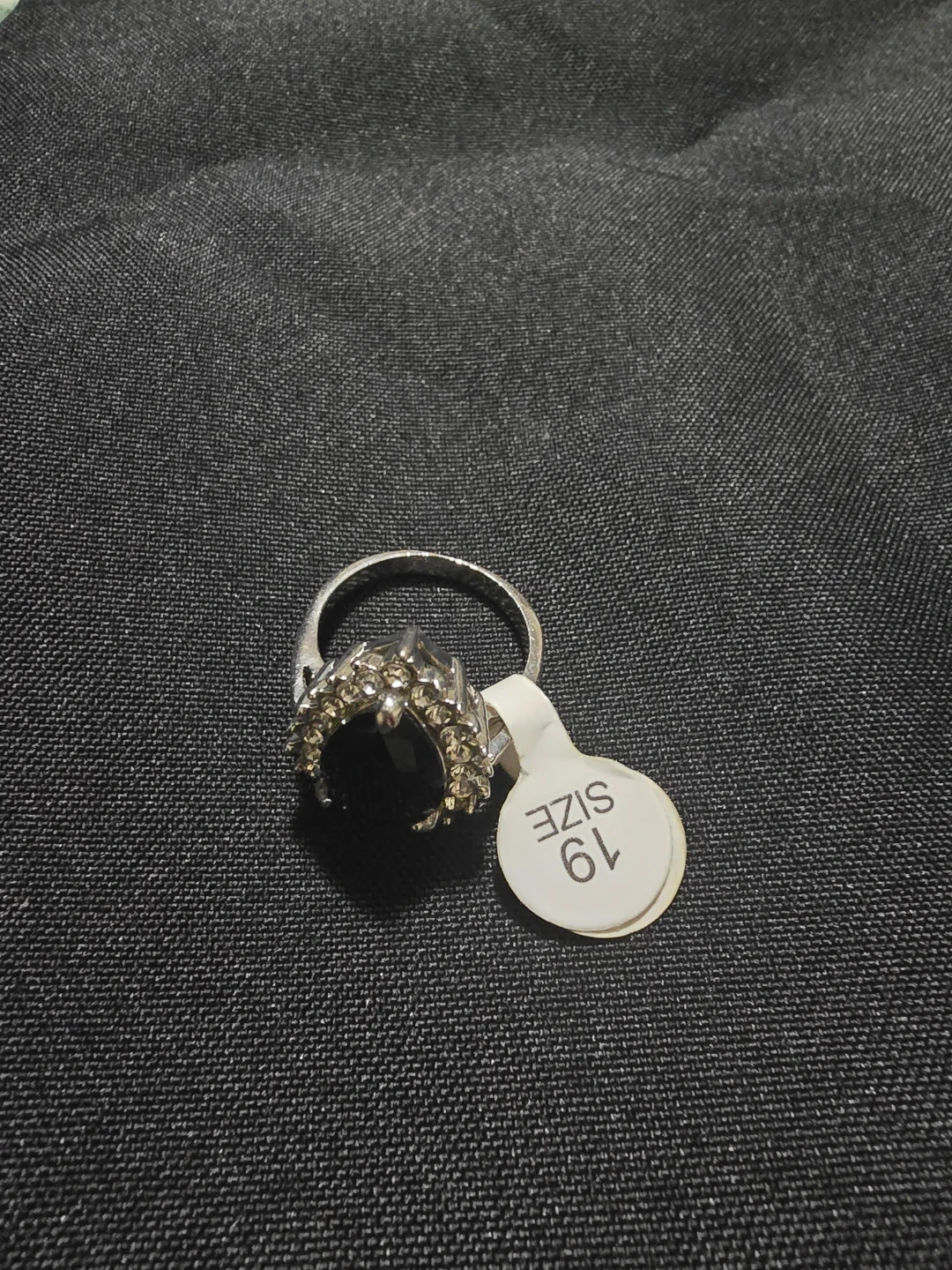 Selling a ring with a black stone, size 19. It comes in a clear plastic box. A nice addition to any jewelry collection!