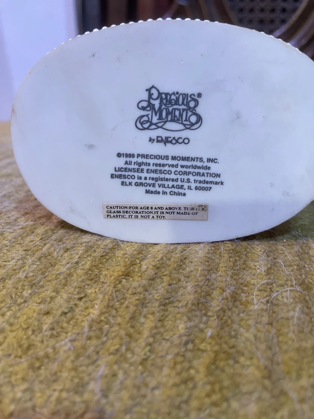 This is a Precious Moments figurine featuring a couple in a snow globe, celebrating an anniversary. It's a sweet piece for collectors or as a decorative item. The base has the Precious Moments logo and copyright information from 1999 by ENESCO. It's marked as a glass decoration and not a toy