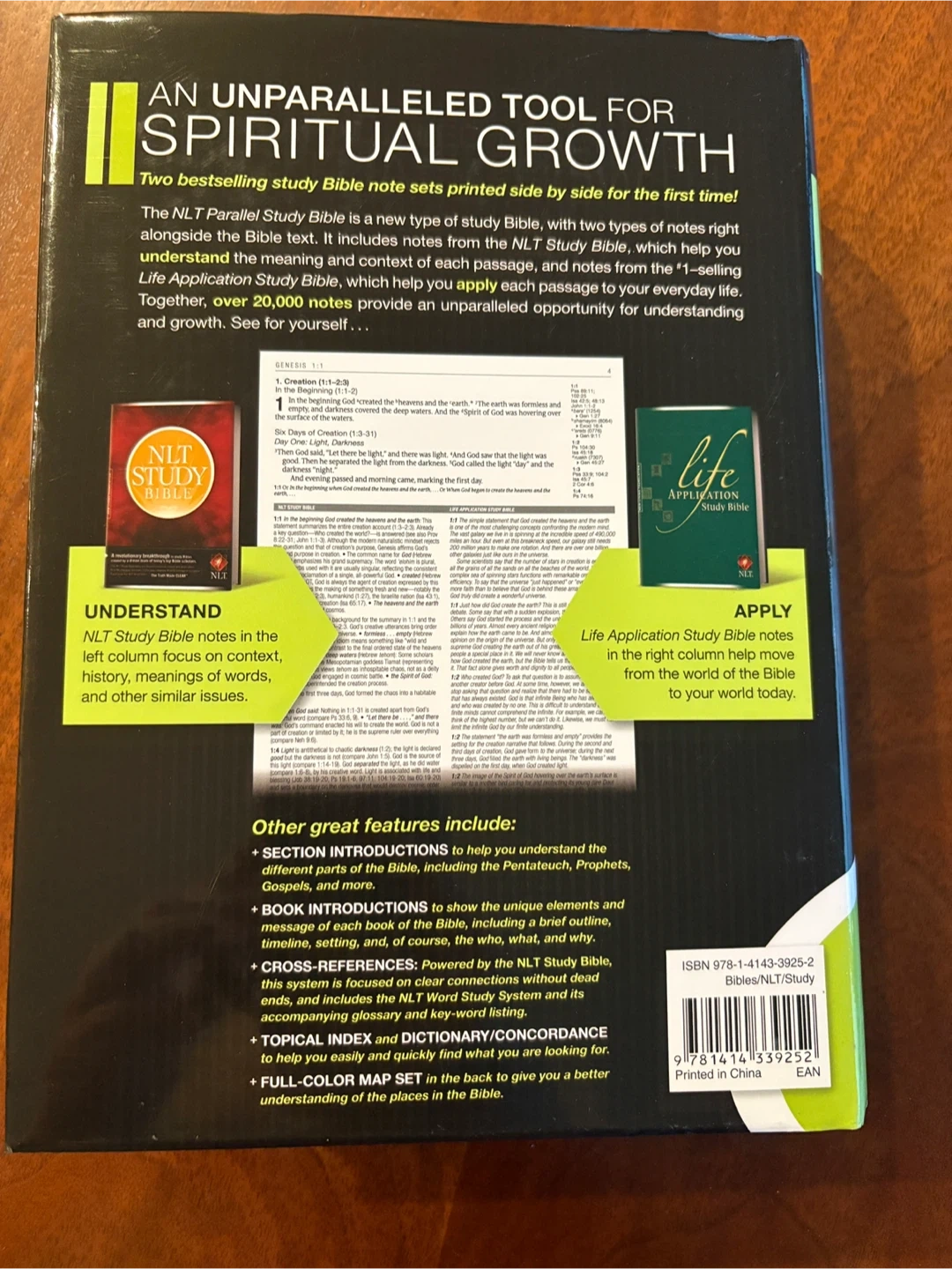 This is the NLT Parallel Study Bible, includes two bestselling study Bible note sets printed side by side, an unparalleled tool for spiritual growth, clear practical application for thousands of Bible verses. It is the ideal study resource for pastors, Bible teachers, and students of the Bible