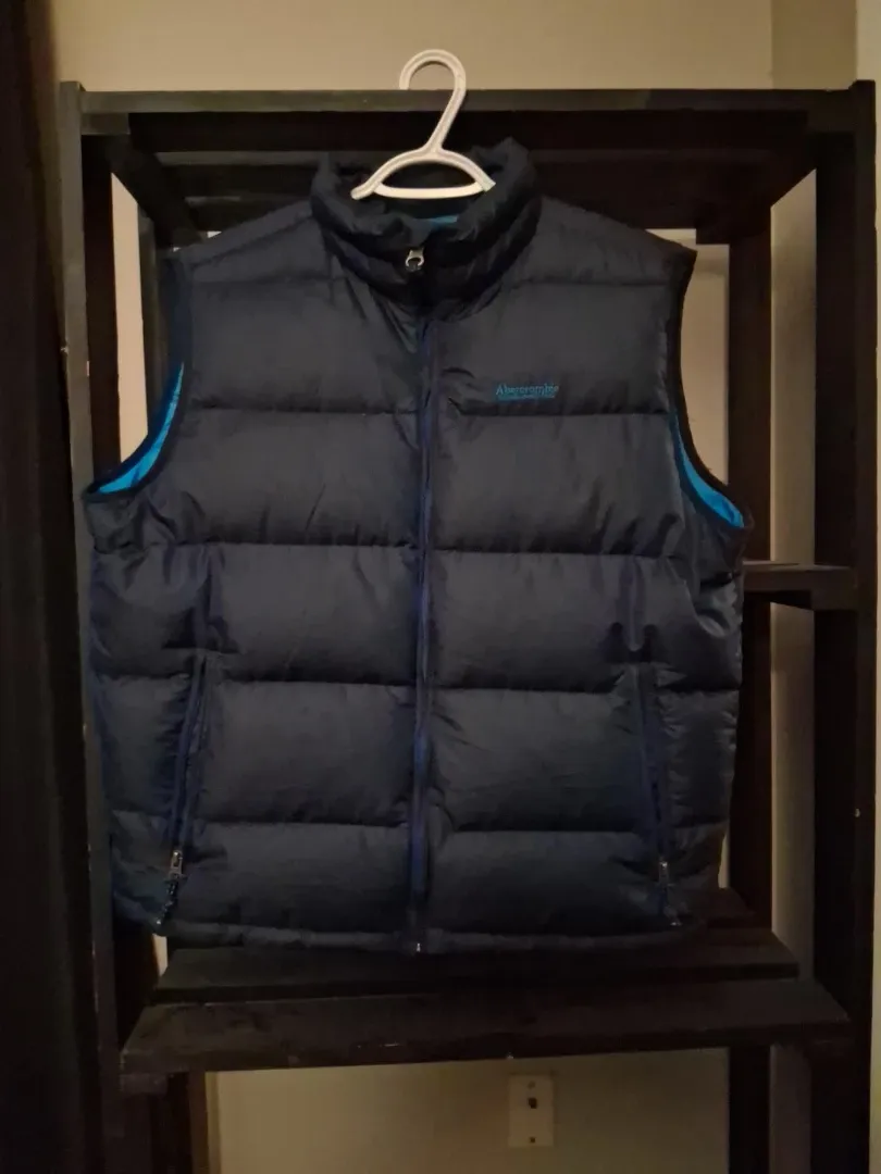 Here's a Abercrombie & Fitch puffer vest in navy blue in mint condition. It's perfect for layering during cooler weather!