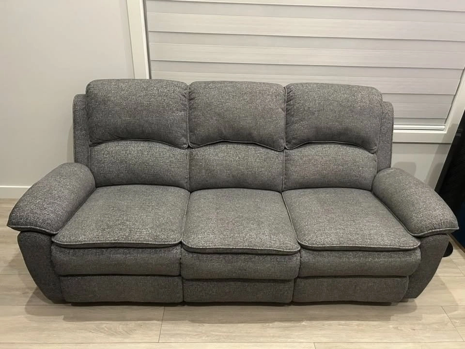 Upgrade your living room with this stylish and comfortable gray reclining sofa and loveseat set. Both pieces are in excellent condition and feature soft, durable fabric with plush cushioning for maximum comfort. The sofa offers ample seating for three, while the loveseat is perfect for cozy two-person seating. The reclining feature ensures ultimate relaxation. Ideal for any modern home!