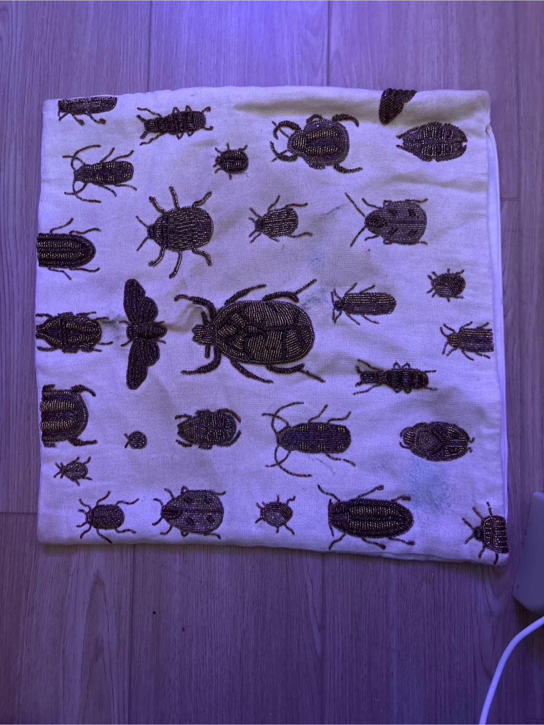 This is a Jonathan Adler hand beaded pillow cover with a bug print design. It has a natural, off-white color with brown beaded bugs. It's in good condition and would be a fun addition to any room